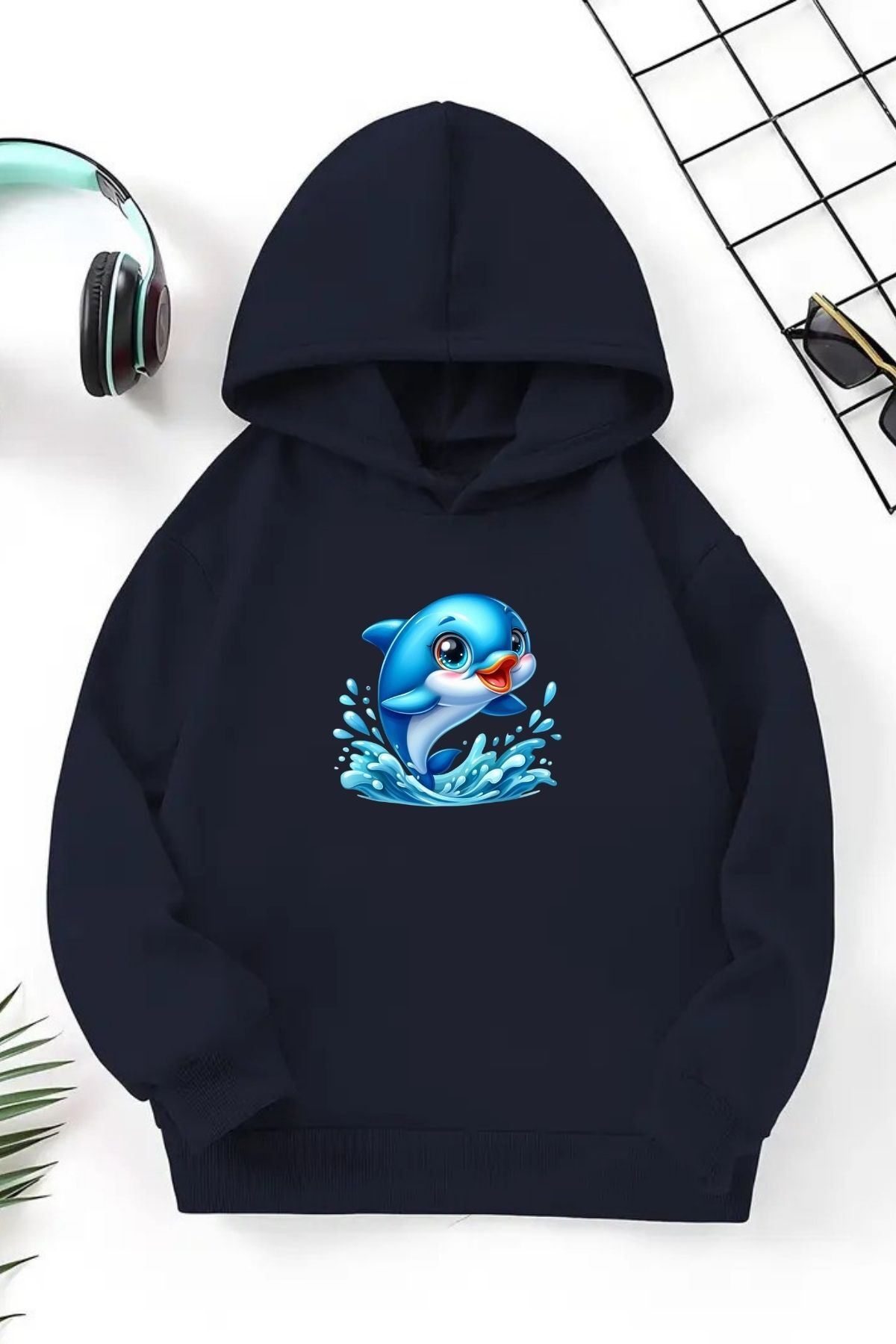 Unisex Lacivert Cocuk Kapüşonlu Sweatshirt –Yunus ,Baskılı Şardonlu Kalın Kumaş