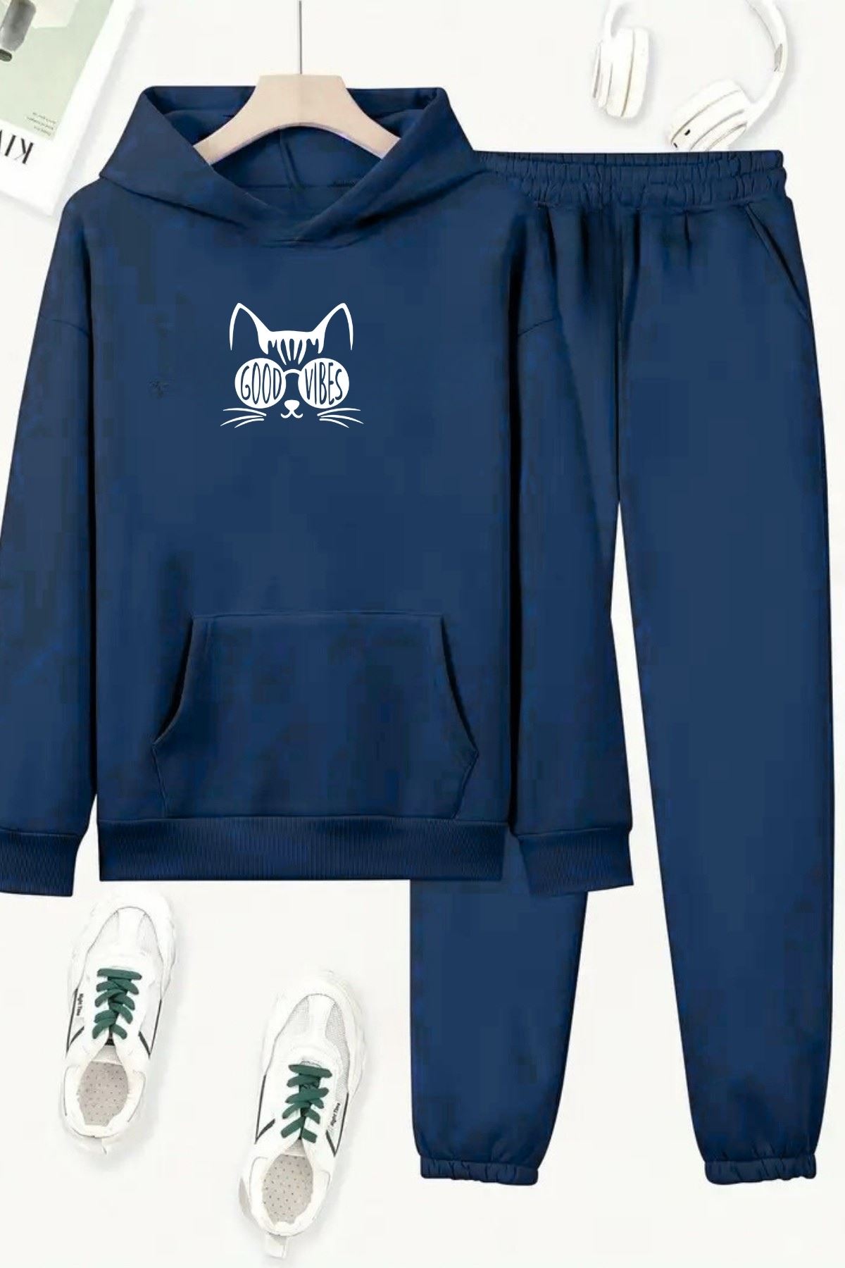 Unisex Lacivert GOOD VİBES CAT Baskılı Eşofman Kapüşon- Kışlık Şardonlu Kumaş
