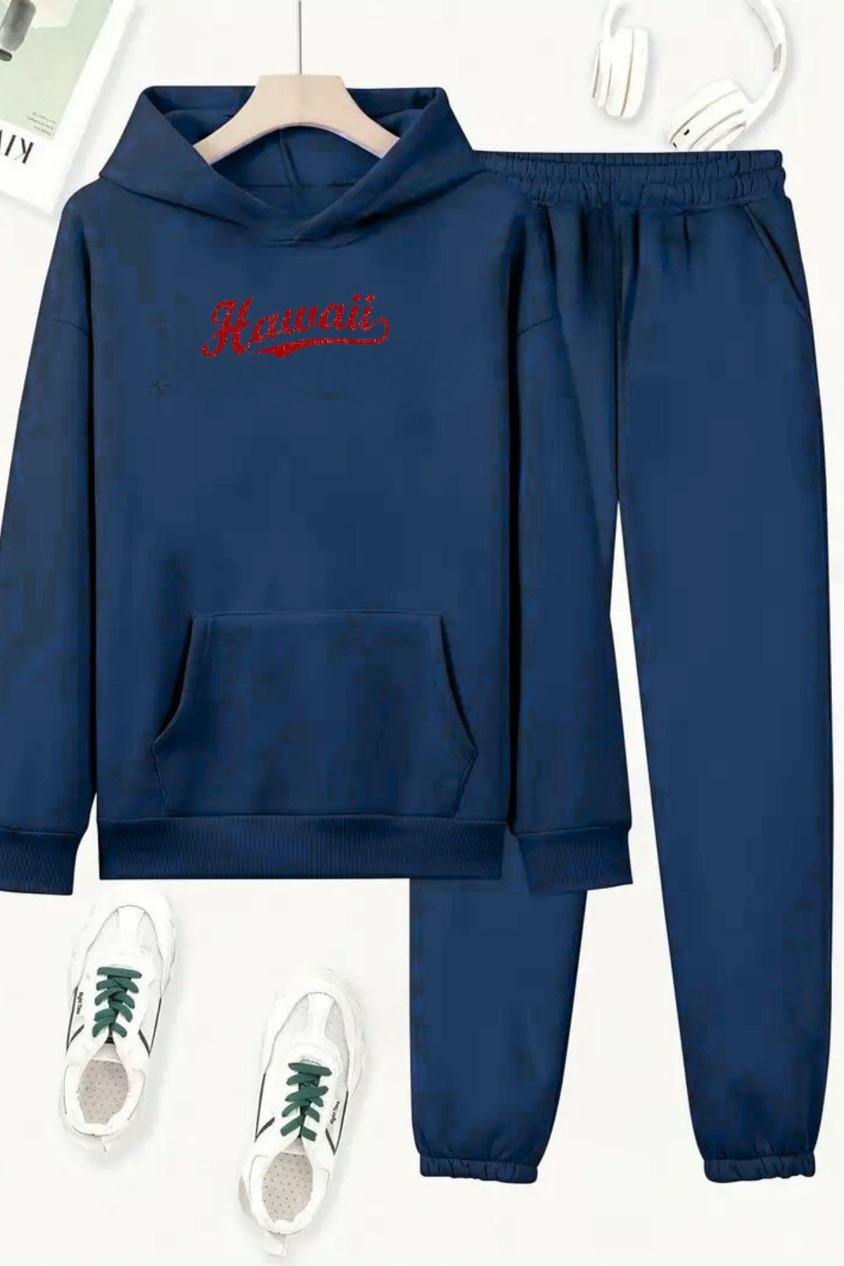 Unisex Lacivert HAWAİ Baskılı Eşofman Kapüşon- Kışlık Şardonlu Kumaş