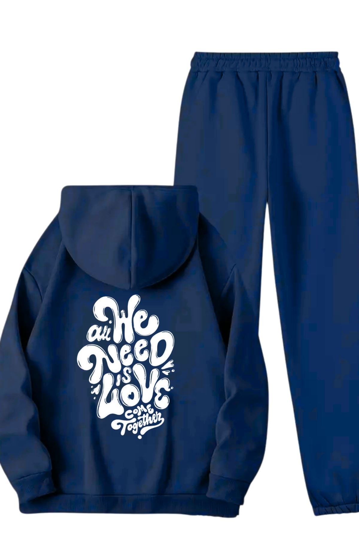Unisex Lacivert WE NEED LOVE SIRT Baskılı Eşofman Kapüşon- Kışlık Şardonlu Kumaş