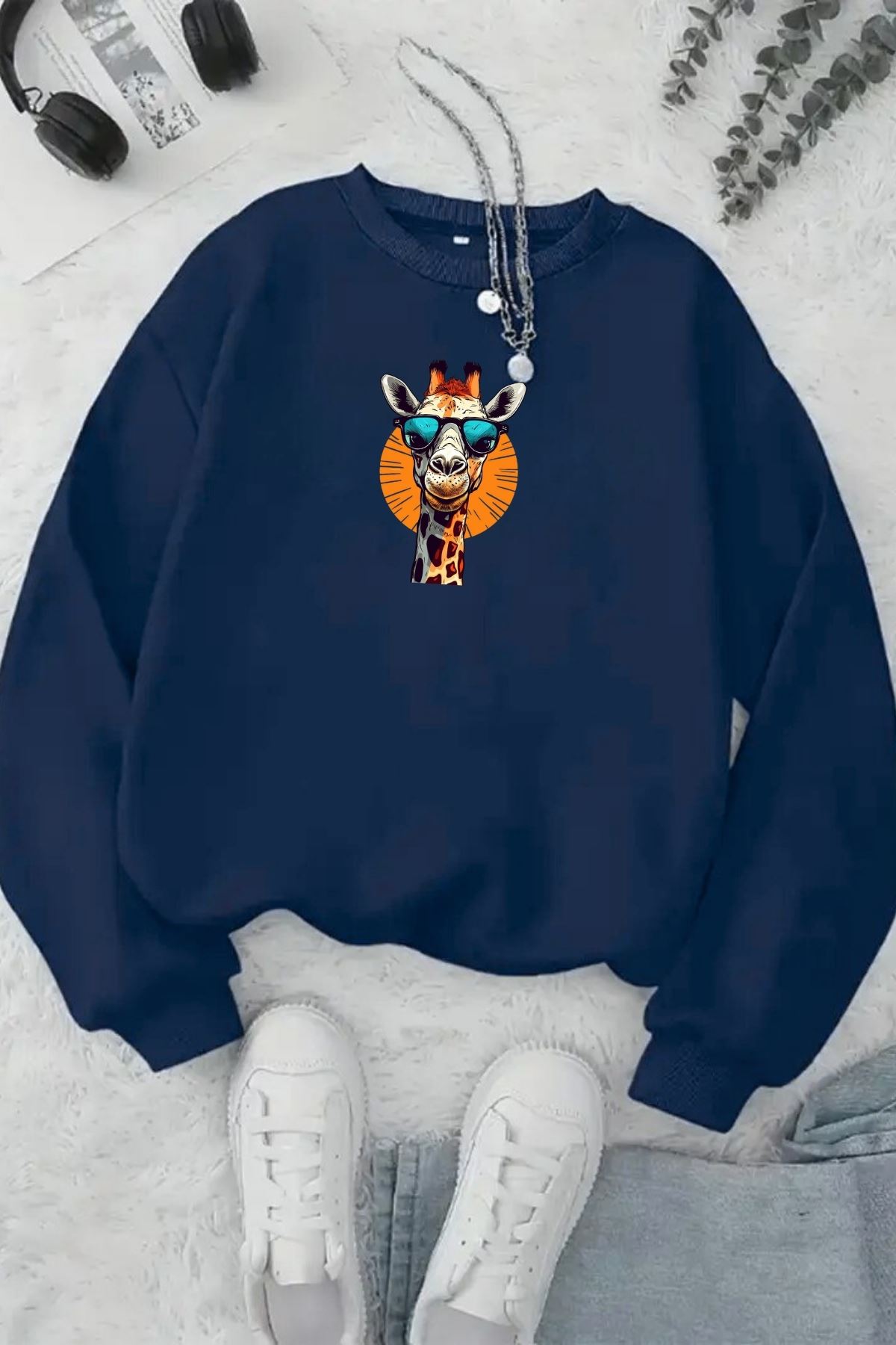 Unisex Lacivert ZÜRAFA Baskılı Bisiklet Yaka Sweatshirt- Kışlık Şardonlu Kumaş