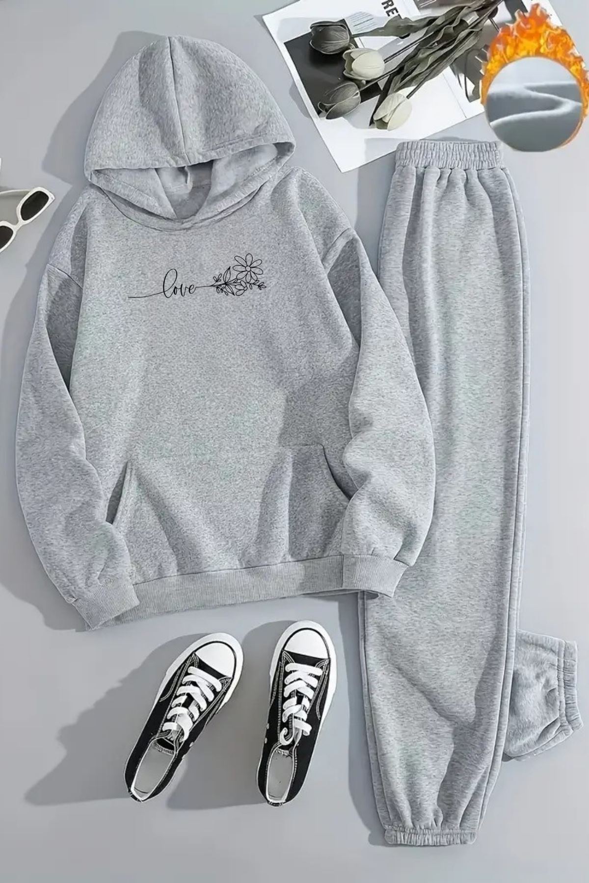 Unisex LOVE ÇİZGİ Baskılı Kapüşonlu Gri Eşofman Takımı - Kışlık Şardonlu Kumaş