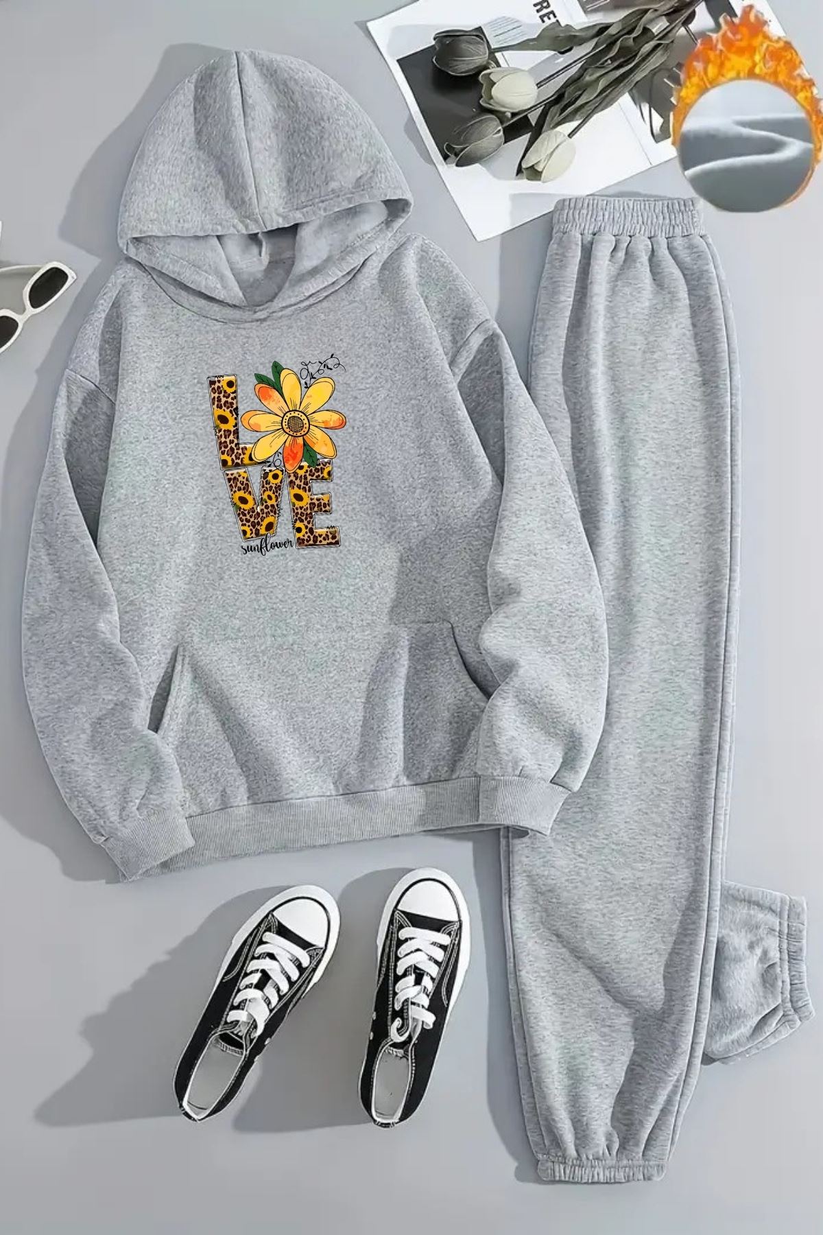 Unisex LOVE LEOPAR Baskılı Kapüşonlu Gri Eşofman Takımı - Kışlık Şardonlu Kumaş