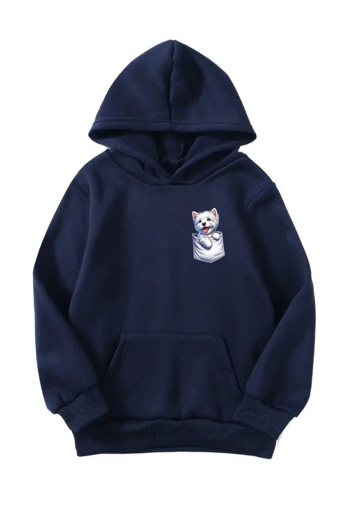 Unisex Oversize Şardonlu Kışlık Cep Detay Köpek Baskılı Kapüşonlu Sweatshirt - Lacivert