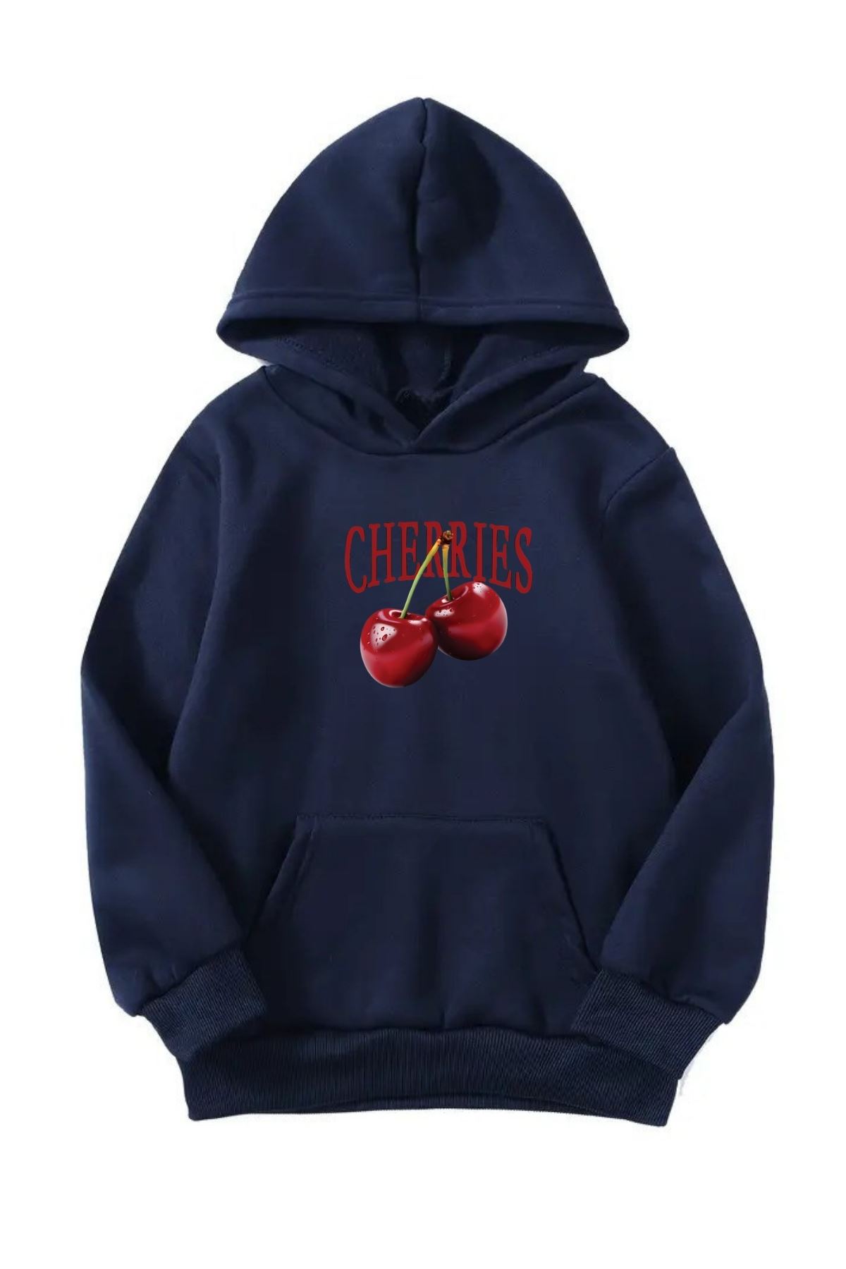 Unisex Oversize Şardonlu Kışlık Cherries Baskılı Kapüşonlu Sweatshirt - Lacivert