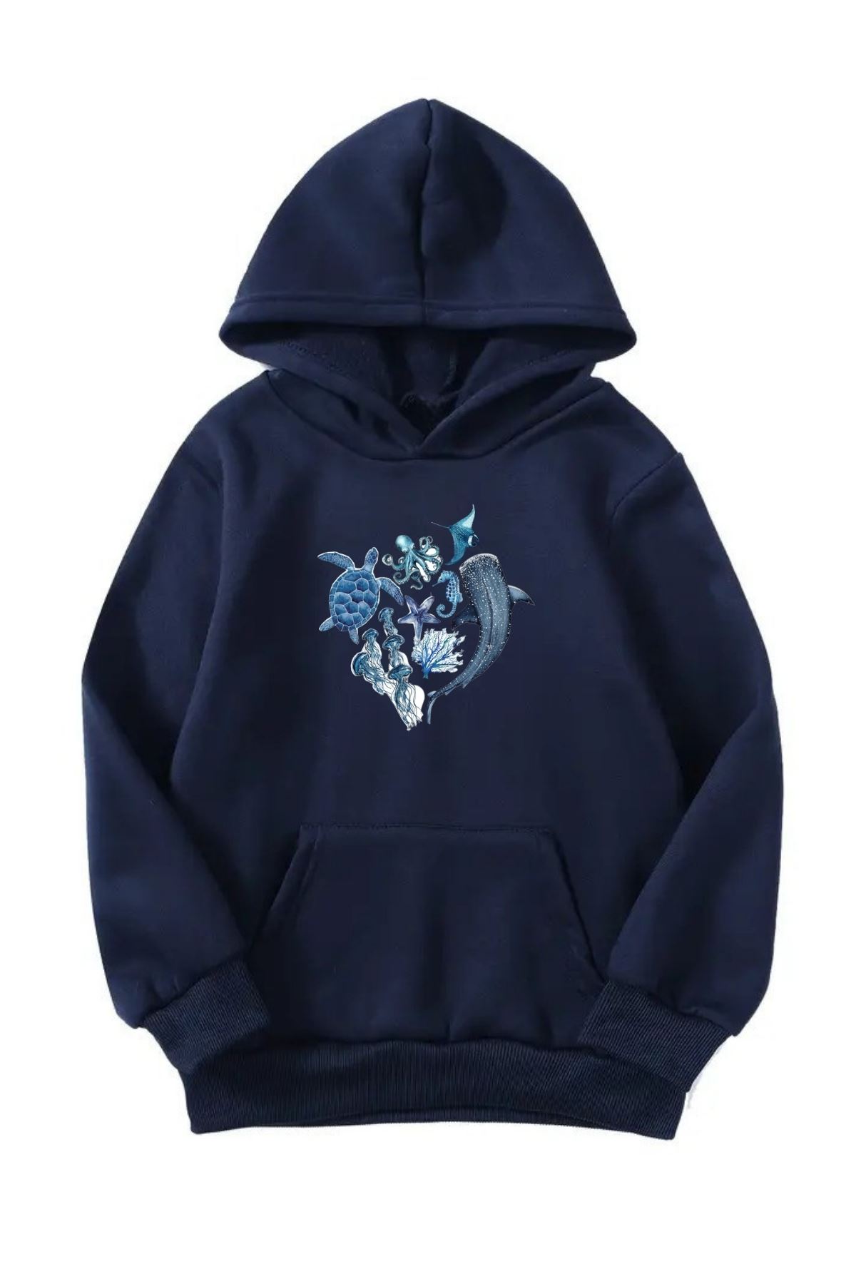 Unisex Oversize Şardonlu Kışlık Deniz Canlıları Baskılı Kapüşonlu Sweatshirt - Lacivert