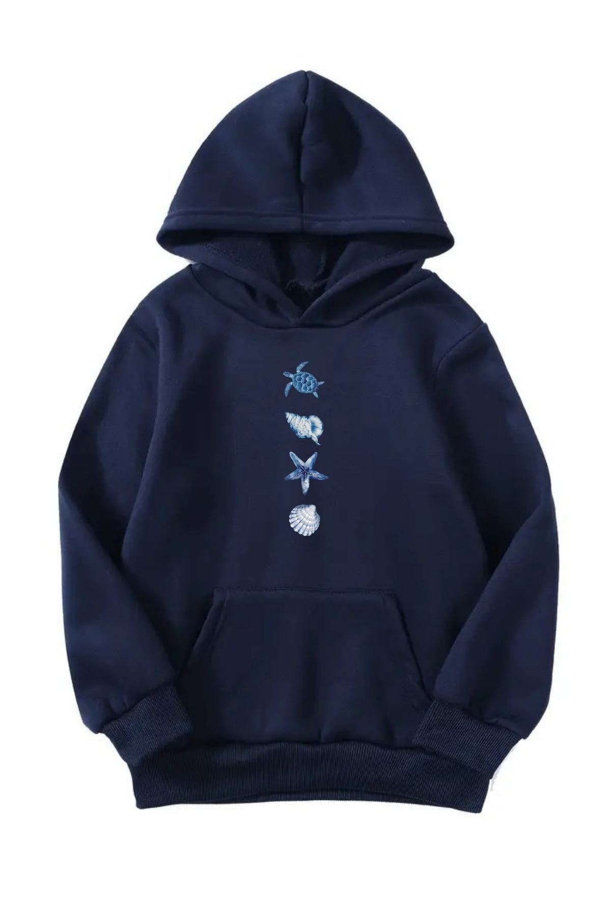 Unisex Oversize Şardonlu Kışlık Dikey Kaplumbağa Baskılı Kapüşonlu Sweatshirt - Lacivert
