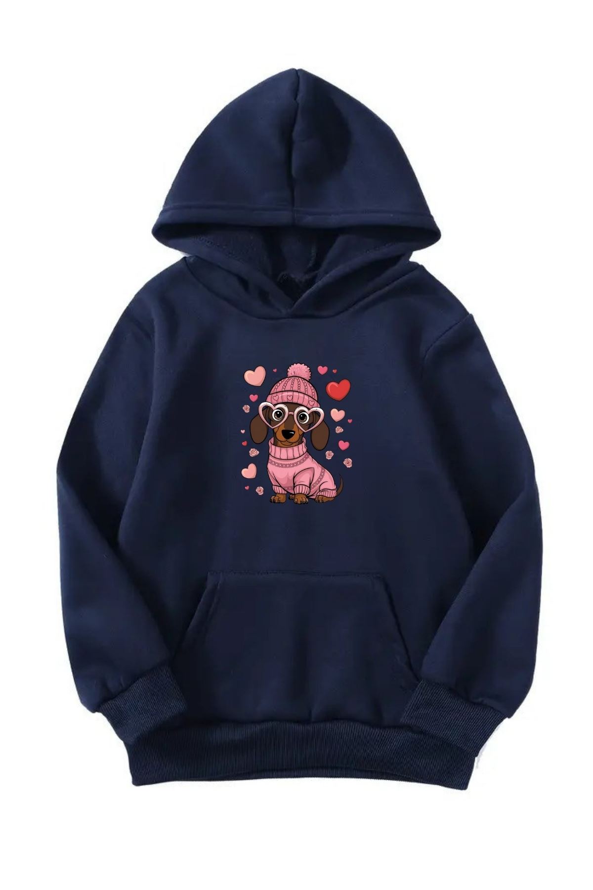 Unisex Oversize Şardonlu Kışlık Kalpli Köpek Baskılı Kapüşonlu Sweatshirt - Lacivert