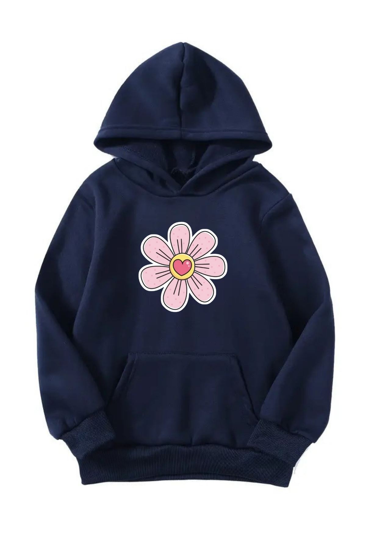 Unisex Oversize Şardonlu Kışlık Kalpli Papatya Baskılı Kapüşonlu Sweatshirt - Lacivert
