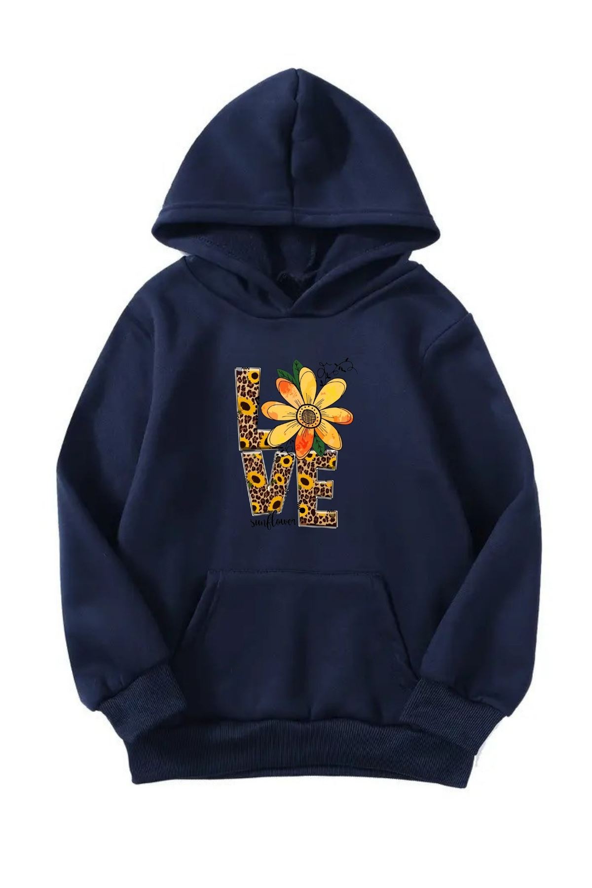 Unisex Oversize Şardonlu Kışlık Love Çiçek Baskılı Kapüşonlu Sweatshirt - Lacivert