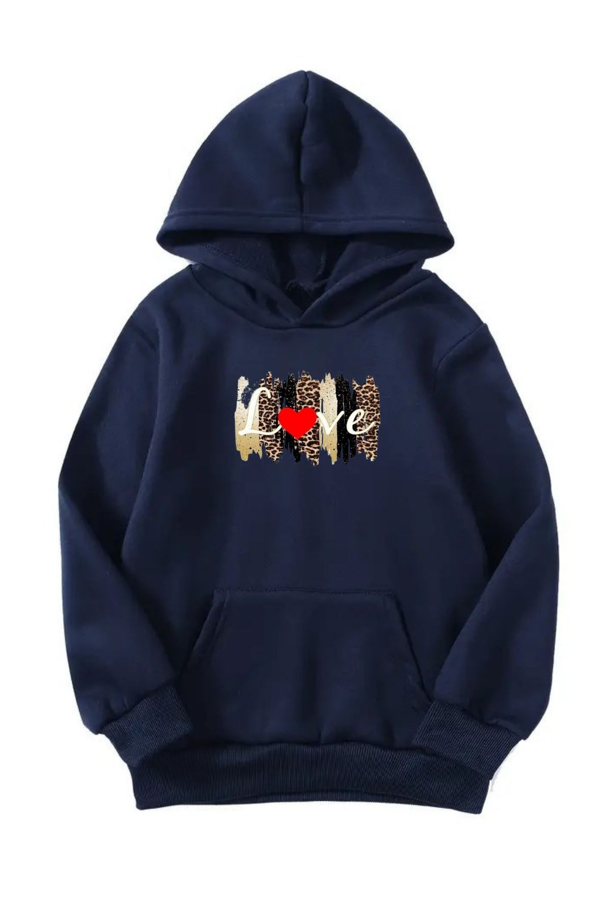 Unisex Oversize Şardonlu Kışlık Love Leopar Baskılı Kapüşonlu Sweatshirt - Lacivert