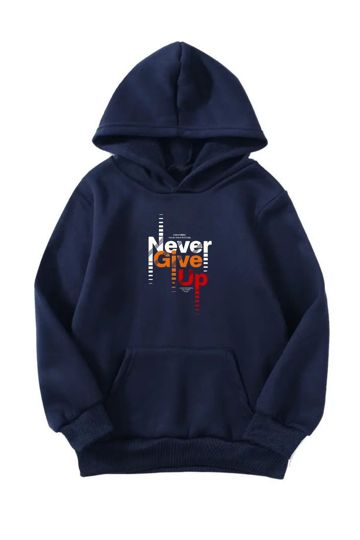 Unisex Oversize Şardonlu Kışlık Never Give Up Baskılı Kapüşonlu Sweatshirt - Lacivert
