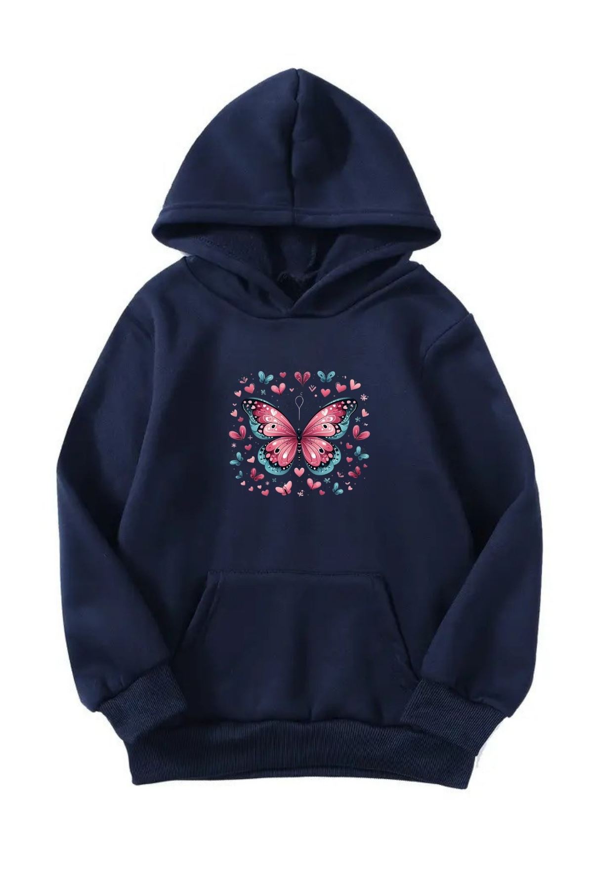 Unisex Oversize Şardonlu Kışlık Renkli Kelebekler Baskılı Kapüşonlu Sweatshirt - Lacivert