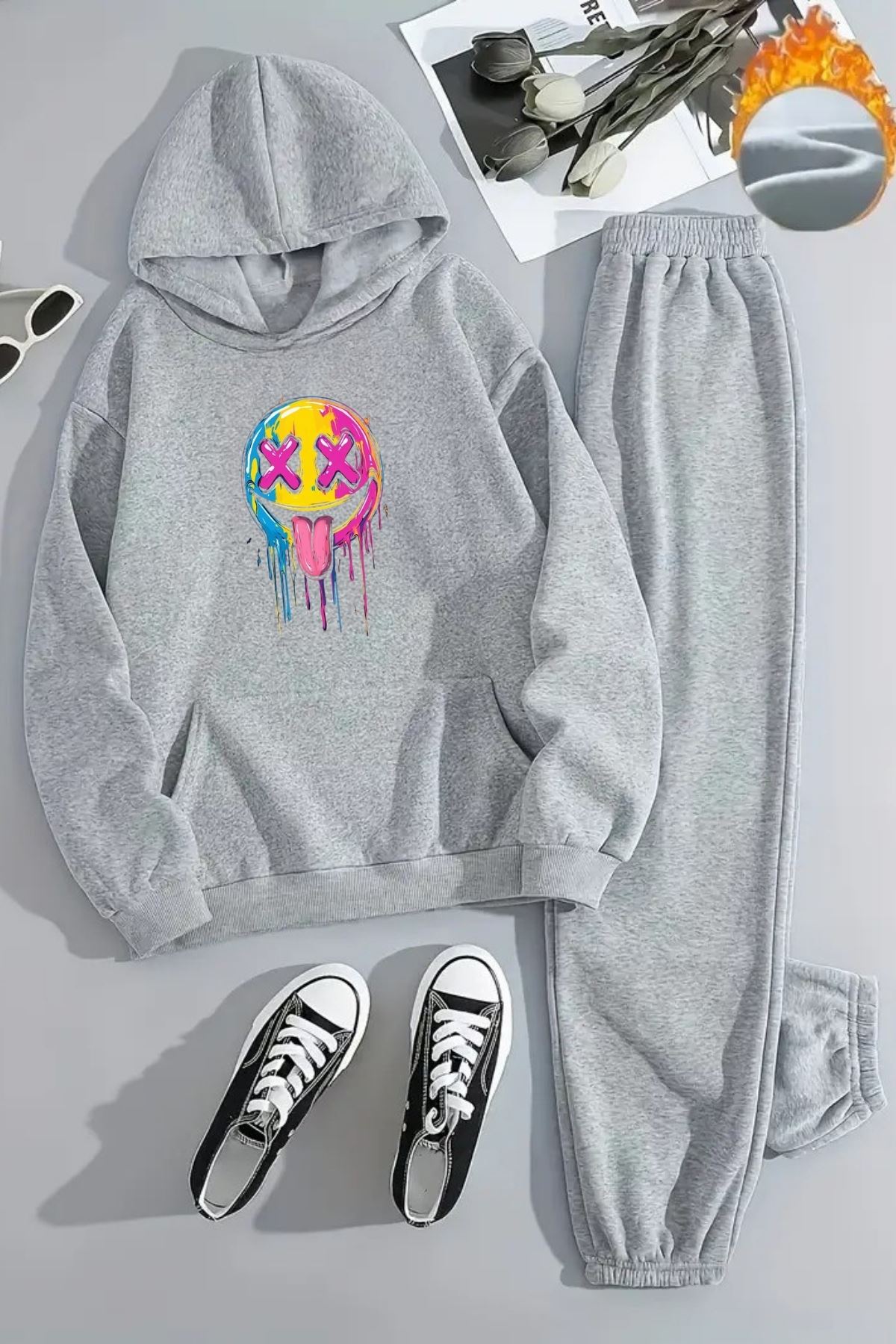 Unisex Renkli Yüz Baskılı Gri Eşofman Takımı - Kışlık Şardonlu Kumaş