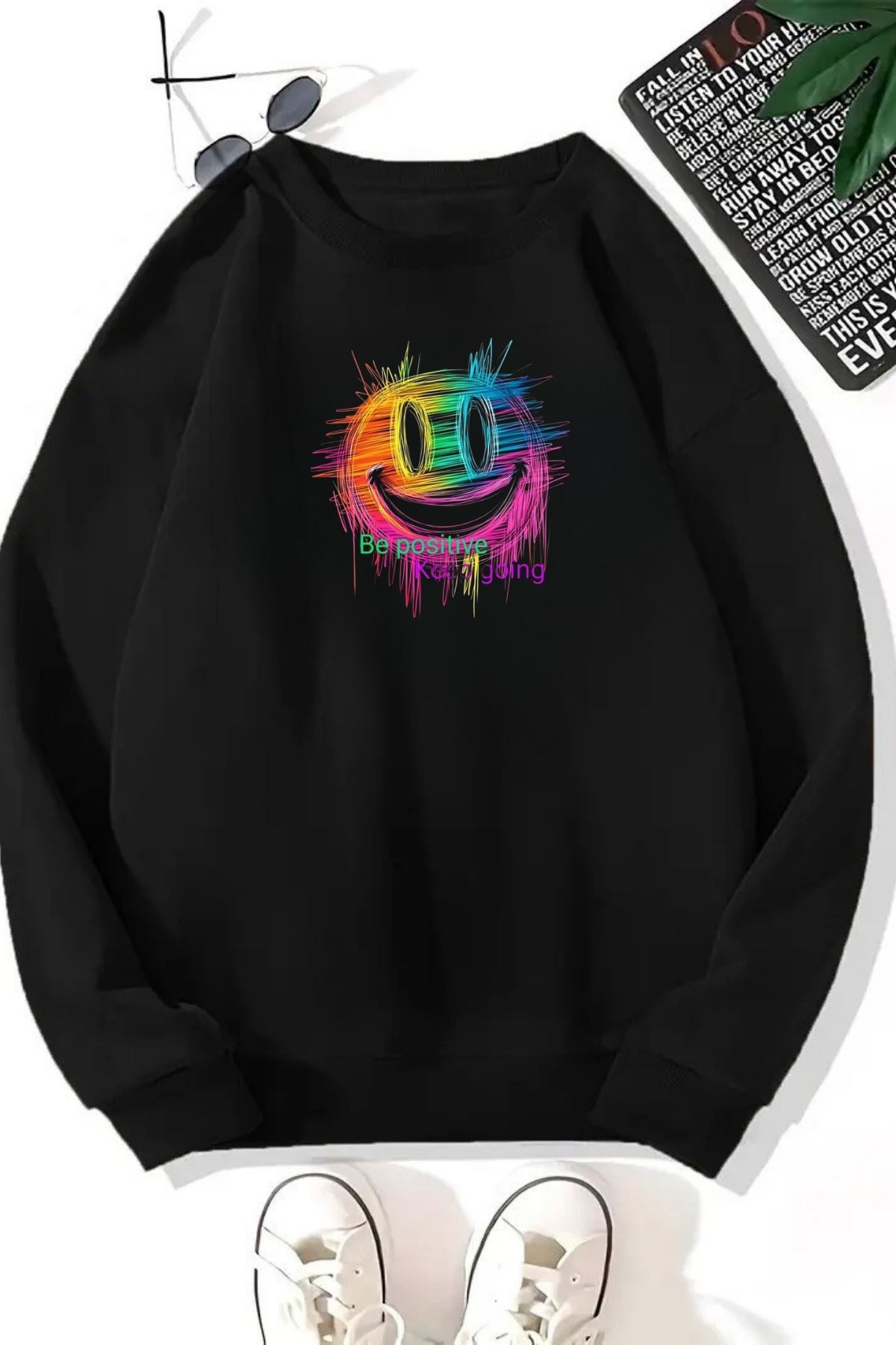 Unisex Siyah BE POSİTİVE Baskılı Bisiklet Yaka Sweatshirt- Kışlık Şardonlu Kumaş