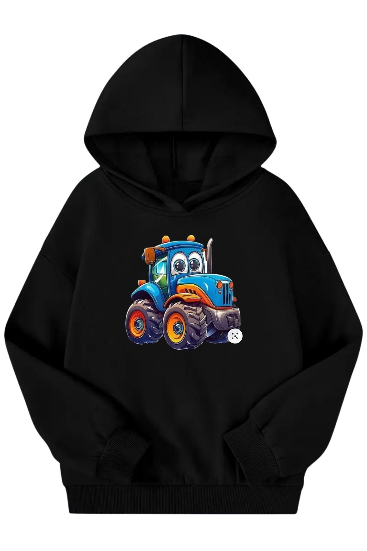 Unisex Siyah Cocuk Kapüşonlu Sweatshirt –Traktörk Baskılı, Şardonlu Kalın Kumaş