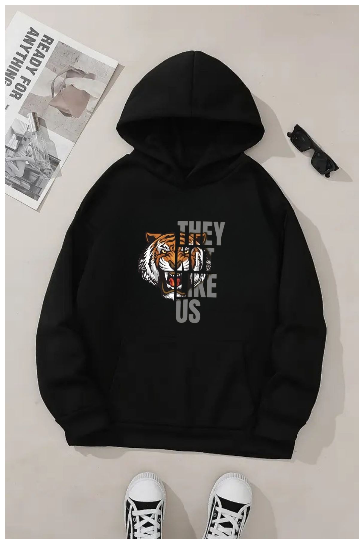 Unisex Siyah Kapüşonlu Sweatshirt – Kaplan Baskılı, Şardonlu Kalın Kumaş