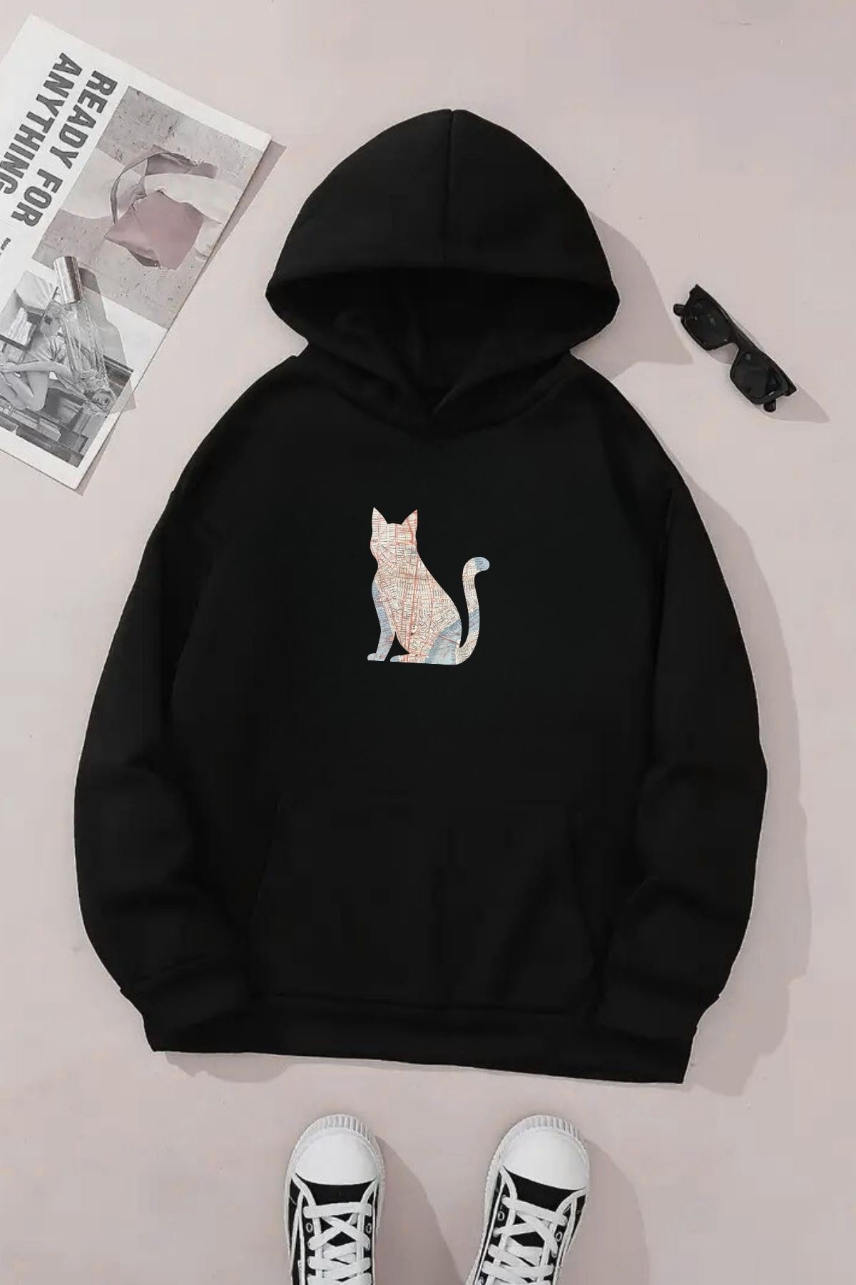 Unisex Siyah Kapüşonlu Sweatshirt – Kedi Baskılı Baskılı, Şardonlu Kalın Kumaş