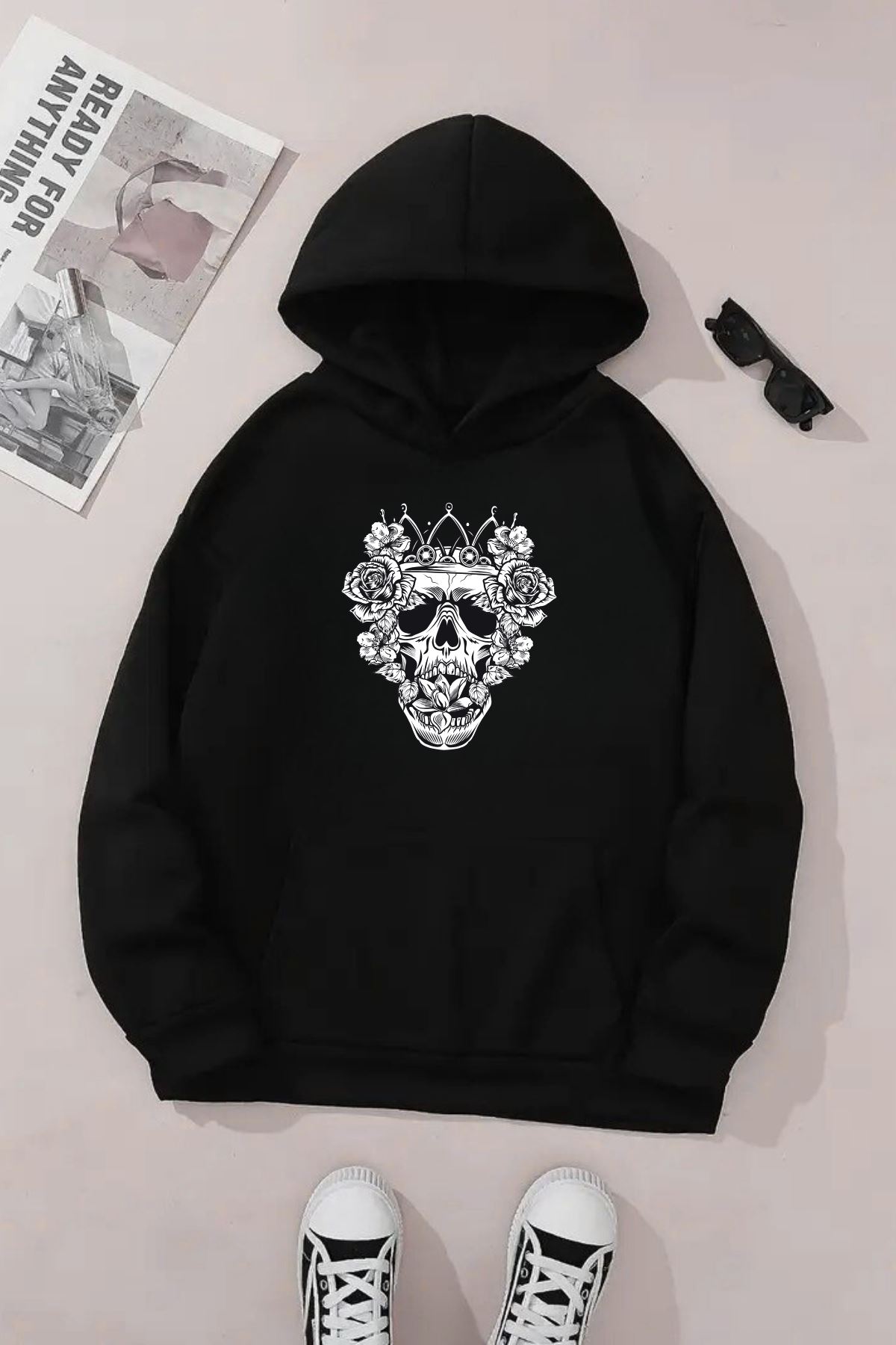 Unisex Siyah Kapüşonlu Sweatshirt – Kuru Kafa Gül Baskılı, Şardonlu Kalın Kumaş