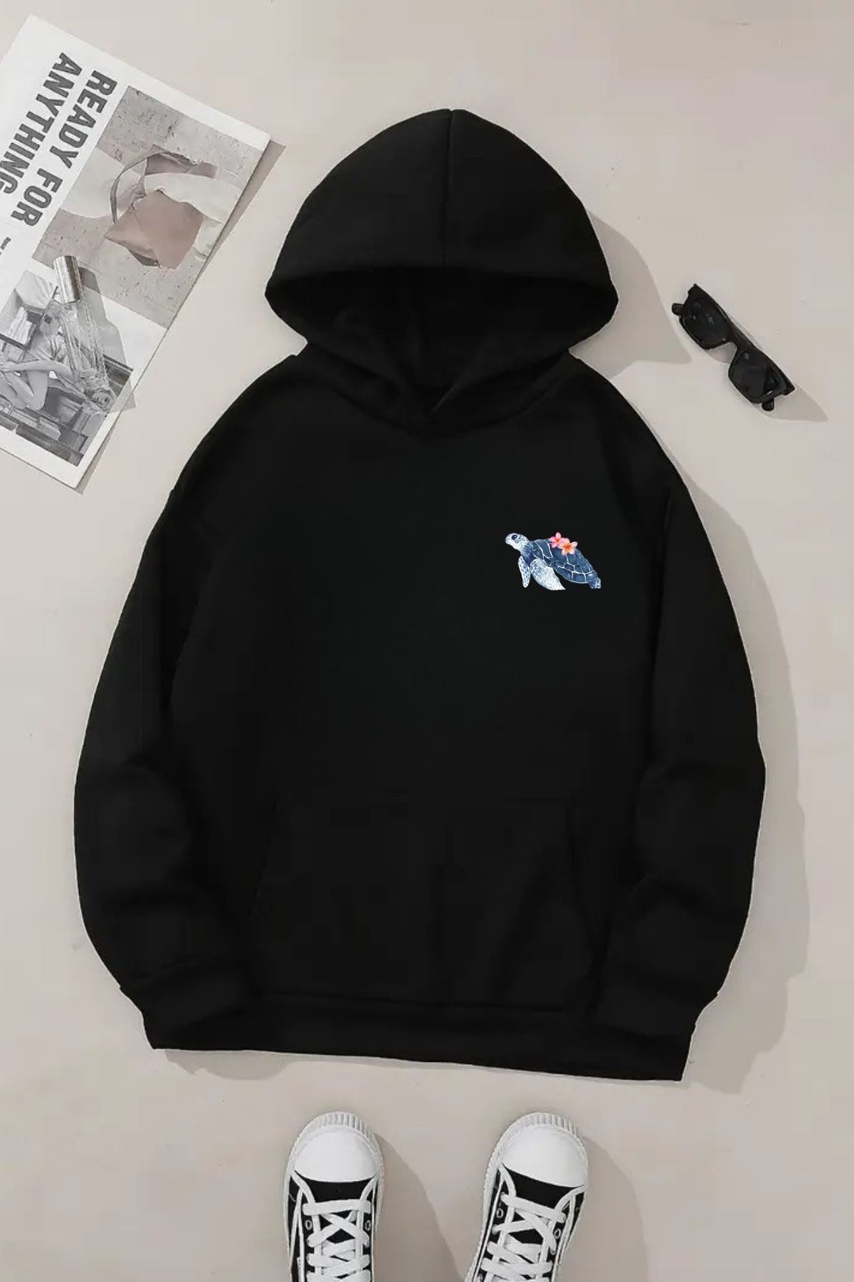 Unisex Siyah Kapüşonlu Sweatshirt – Minimal Kaplumbağa Baskılı, Şardonlu Kalın Kumaş