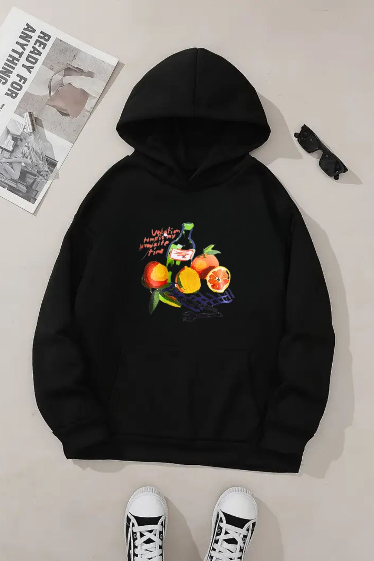 Unisex Siyah Kapüşonlu Sweatshirt – Vacation Baskılı, Şardonlu Kalın Kumaş