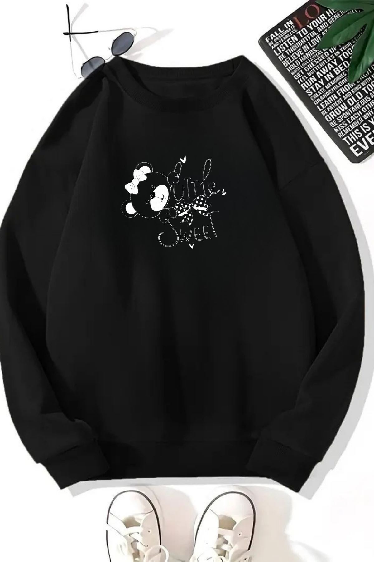 Unisex Siyah LİTTLE SWEET Baskılı Bisiklet Yaka Sweatshirt- Kışlık Şardonlu Kumaş