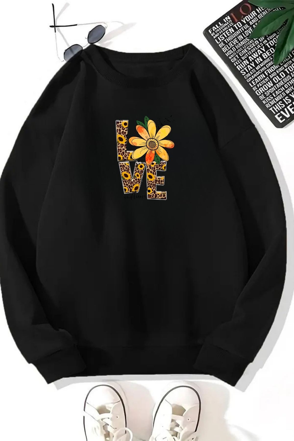Unisex Siyah LOVE Baskılı Bisiklet Yaka Sweatshirt- Kışlık Şardonlu Kumaş