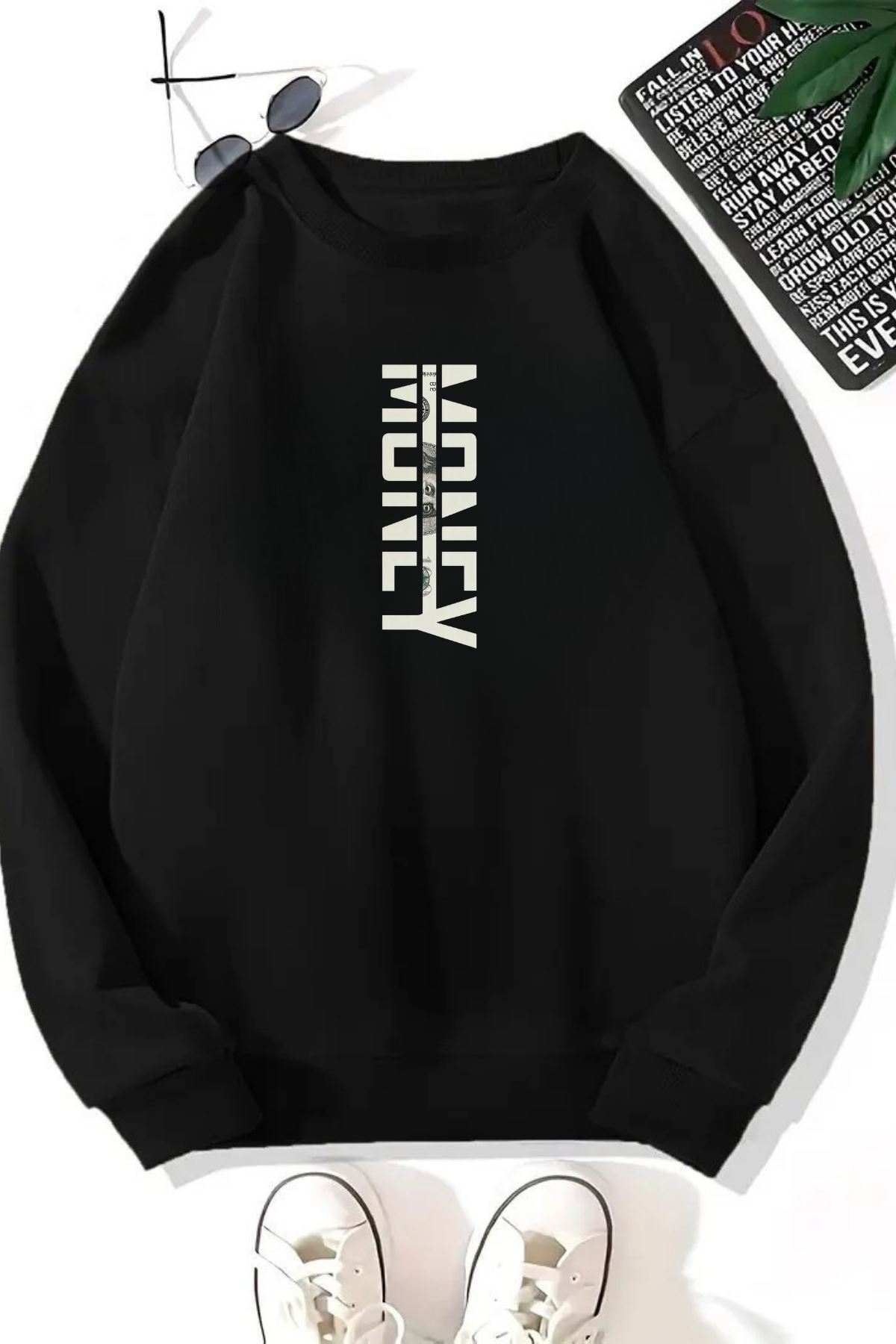 Unisex Siyah MONEY Baskılı Bisiklet Yaka Sweatshirt- Kışlık Şardonlu Kumaş