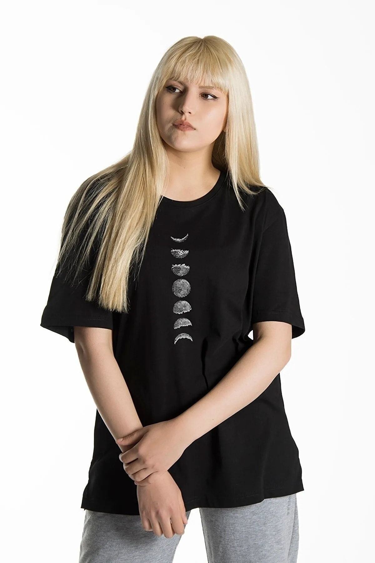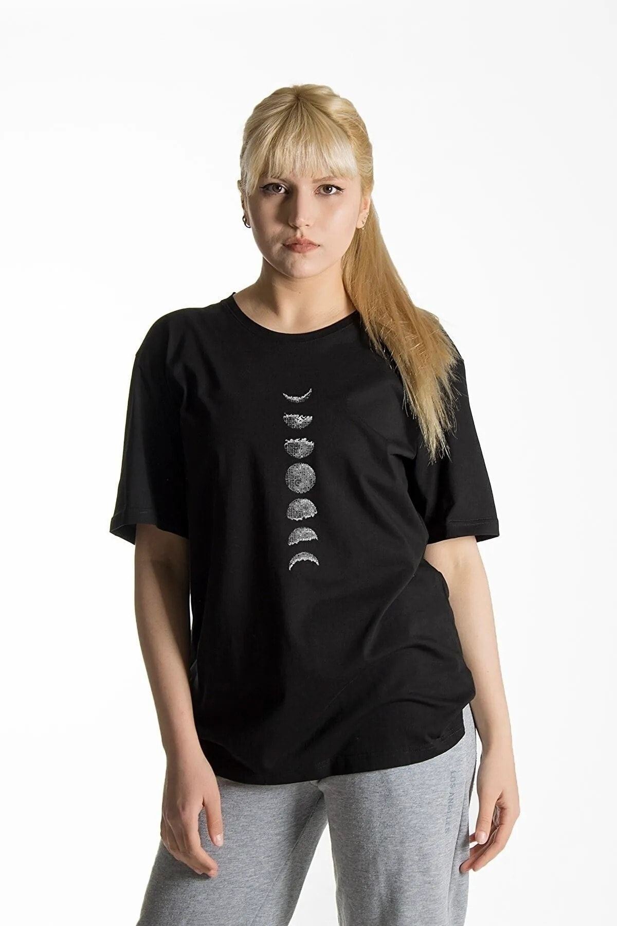 Unisex Siyah Pamuklu Rahat Kesim Oversize T-shirt Ayların Evreleri Baskılı