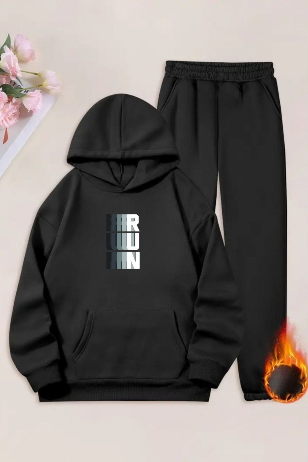 Unisex Siyah RUN Baskılı Eşofman Kapüşon- Kışlık Şardonlu Kumaş