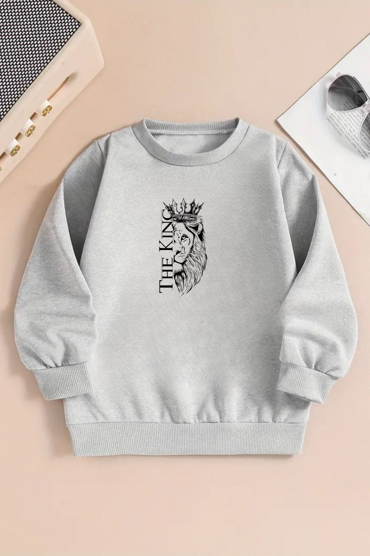 Unisex THE KING Baskılı Gri Bisiklet Yaka Sweatshirt-Kışlık Şardonlu Kumaş