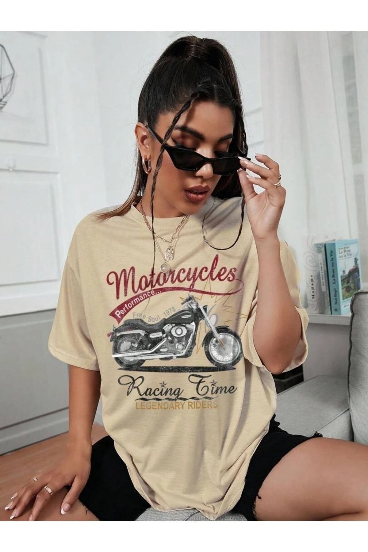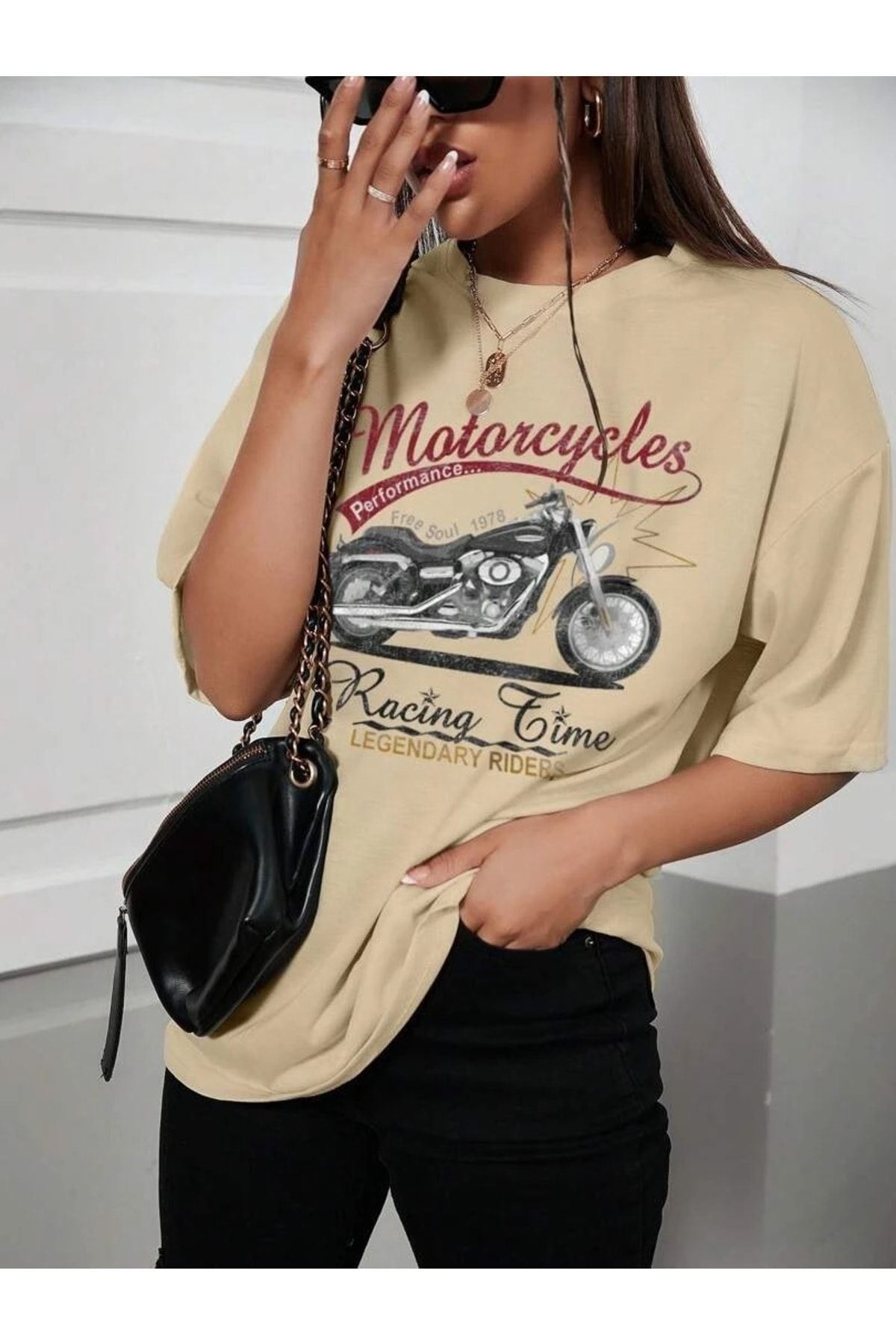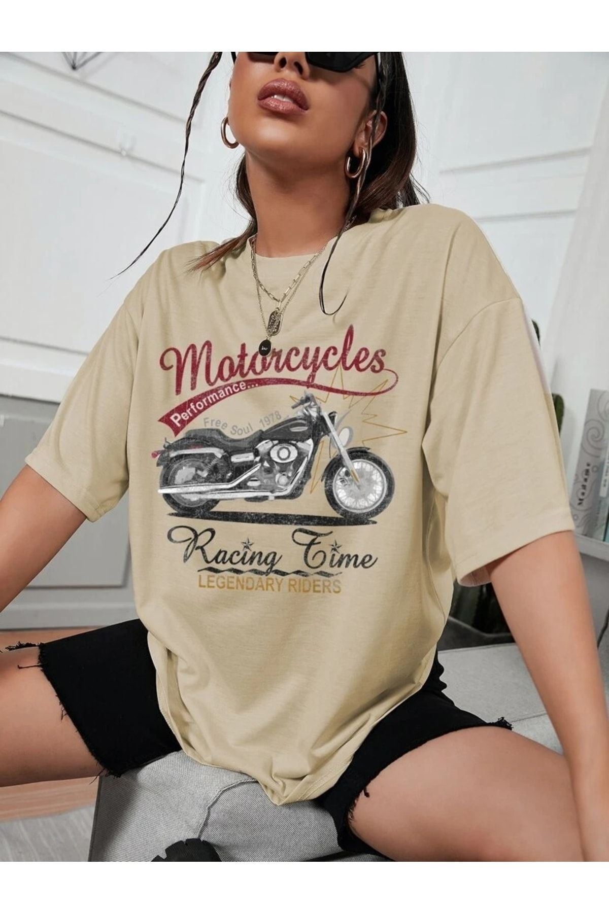 Unisex Vizon Pamuklu Oversize T-shirt Motorsiklet Baskılı