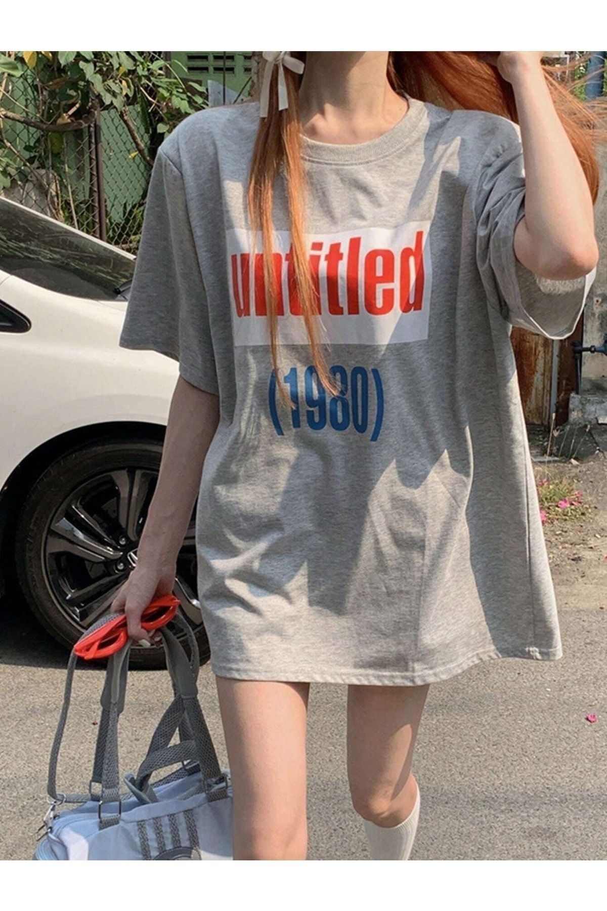 Untitled 1980 T-Shirt - Gri Baskılı Oversize Bisiklet Yaka Kısa Kol