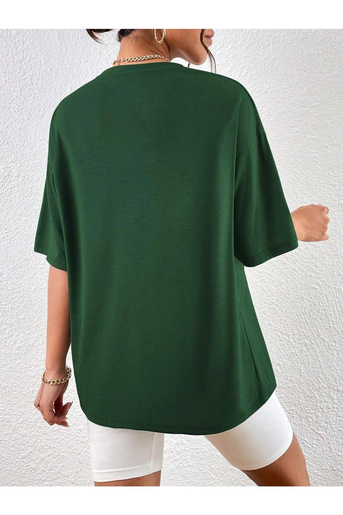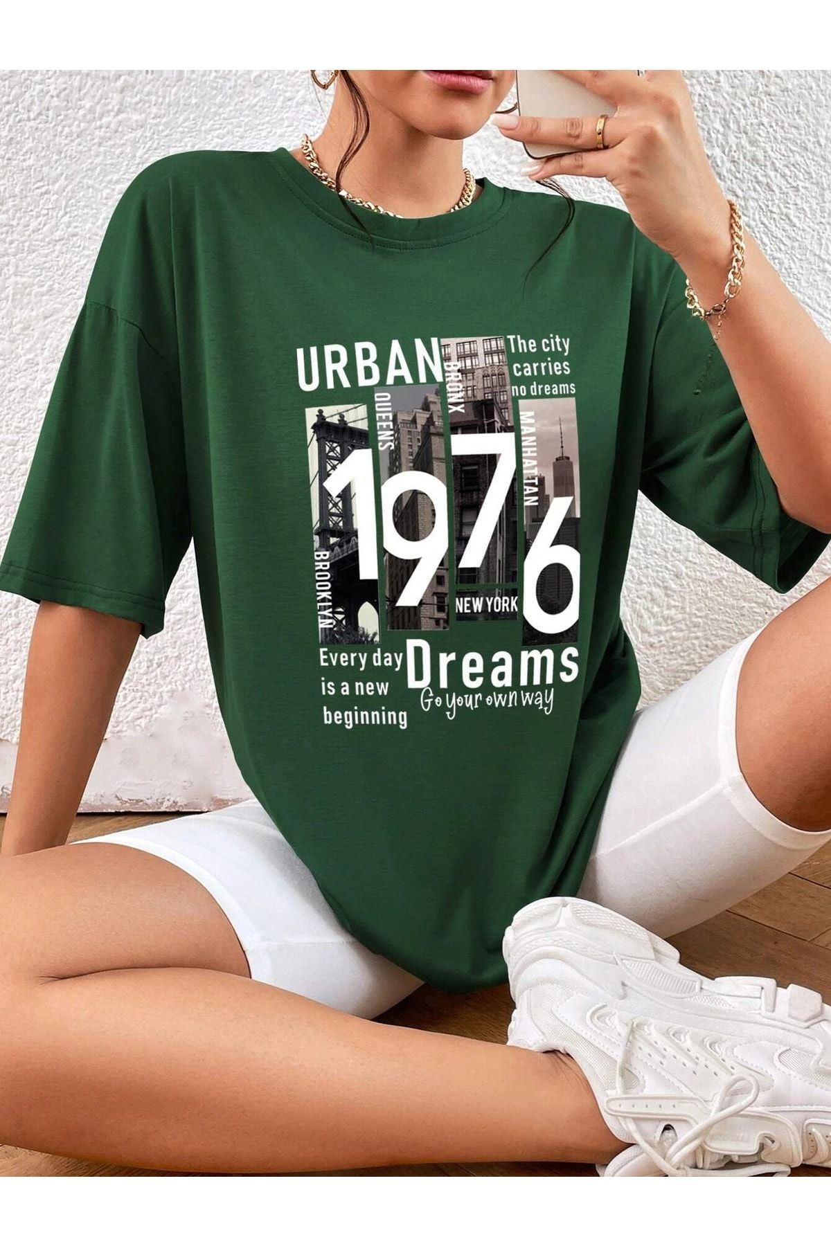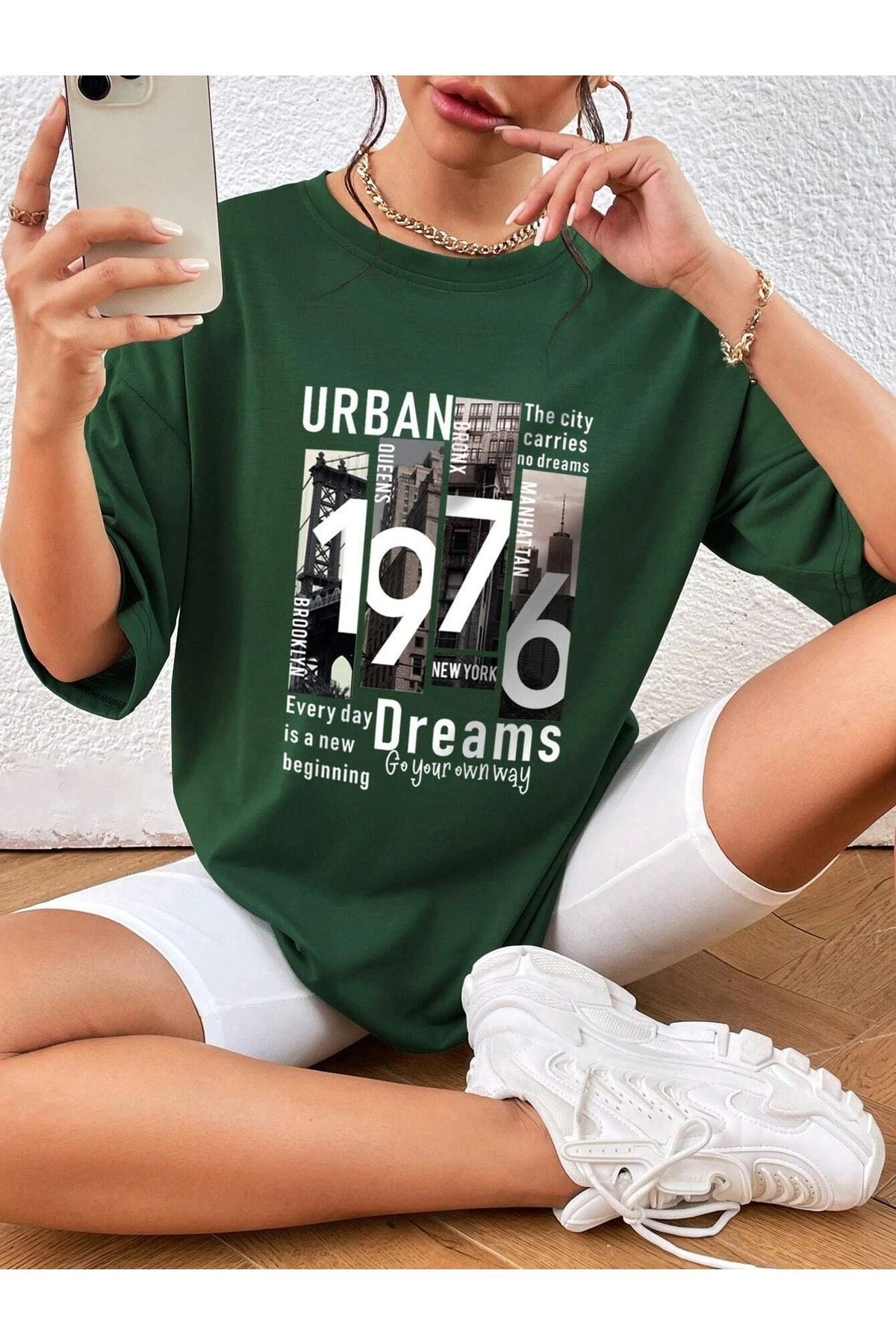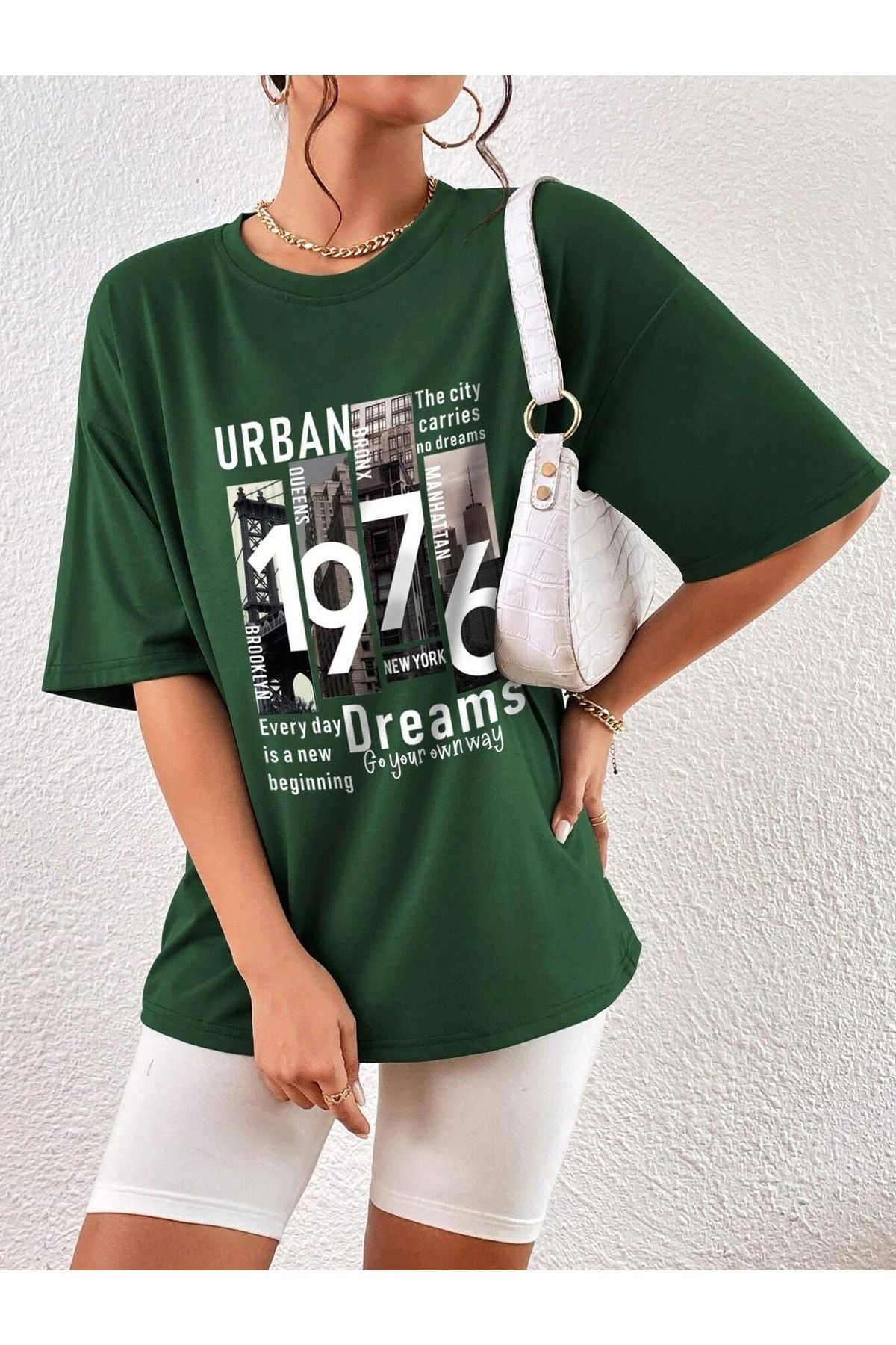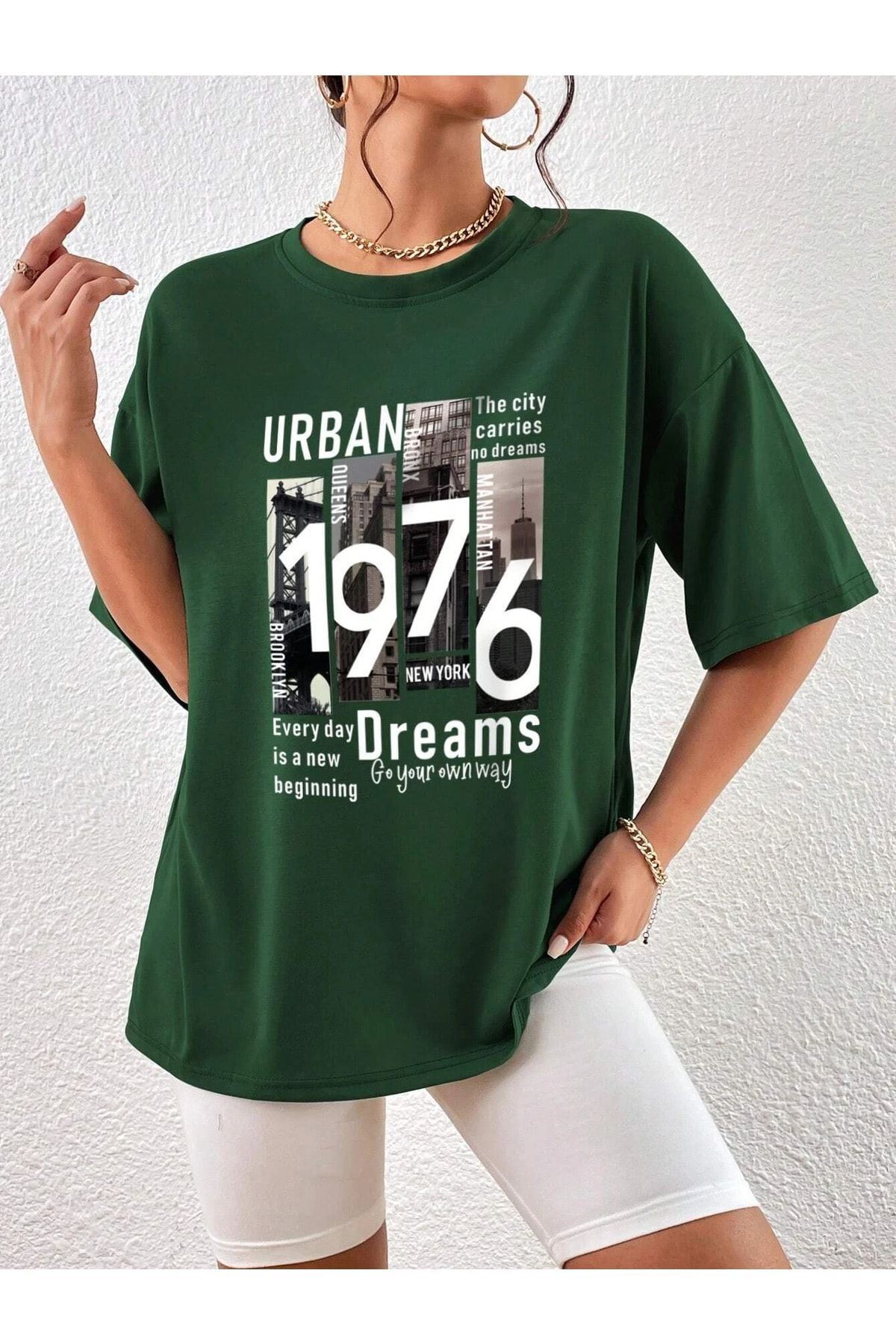 Urban 1976 T-shirt - Yeşil Baskılı Oversize Bisiklet Yaka Kısa Kol Tişört