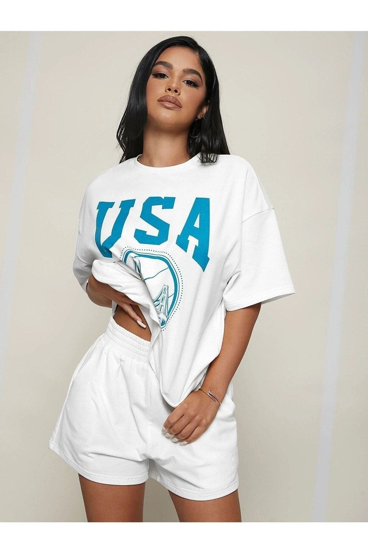 Usa Basketball T-Shirt Şort - Beyaz Alt Üst Kombin Şort Tişört Takım Baskılı Oversize Bisiklet Yaka