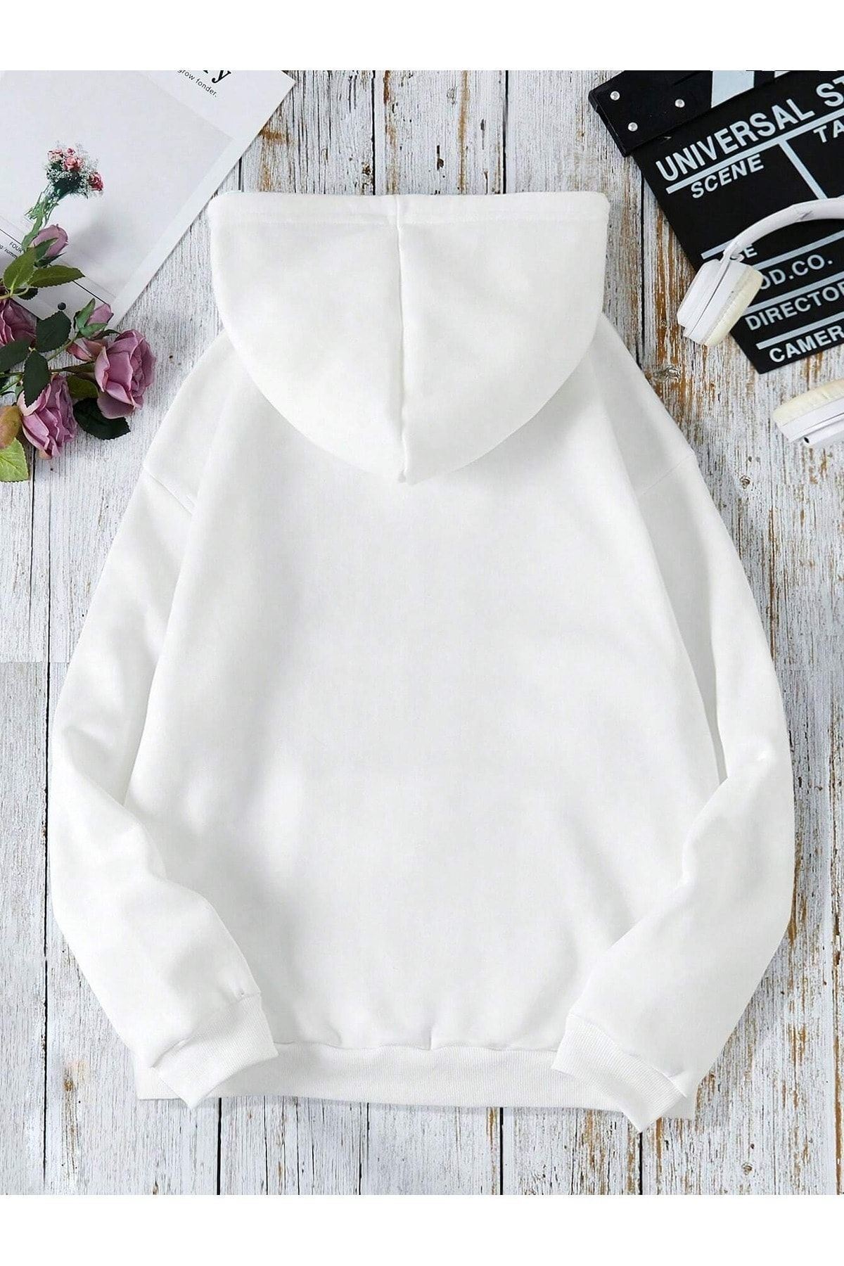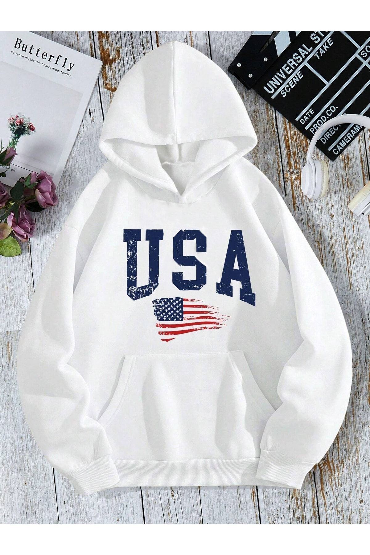 Usa Bayrak Sweatshirt - Beyaz Baskılı Oversize Kapüşonlu