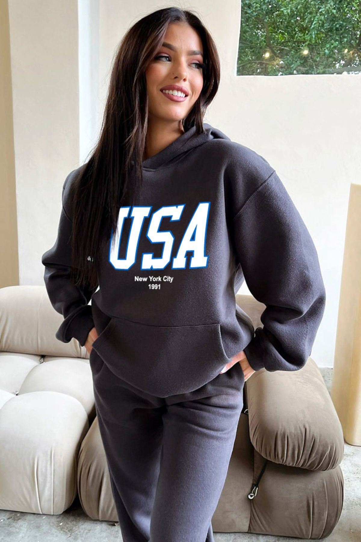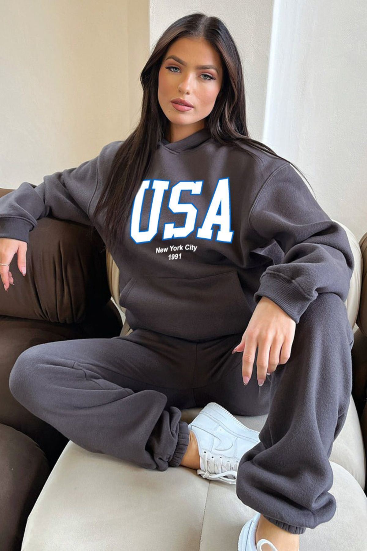 Usa Eşofman Takımı Sweatshirt Jogger - Füme Baskılı Oversize Şardonlu Kapüşonlu