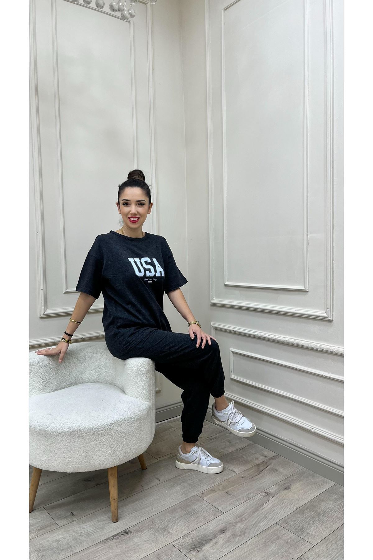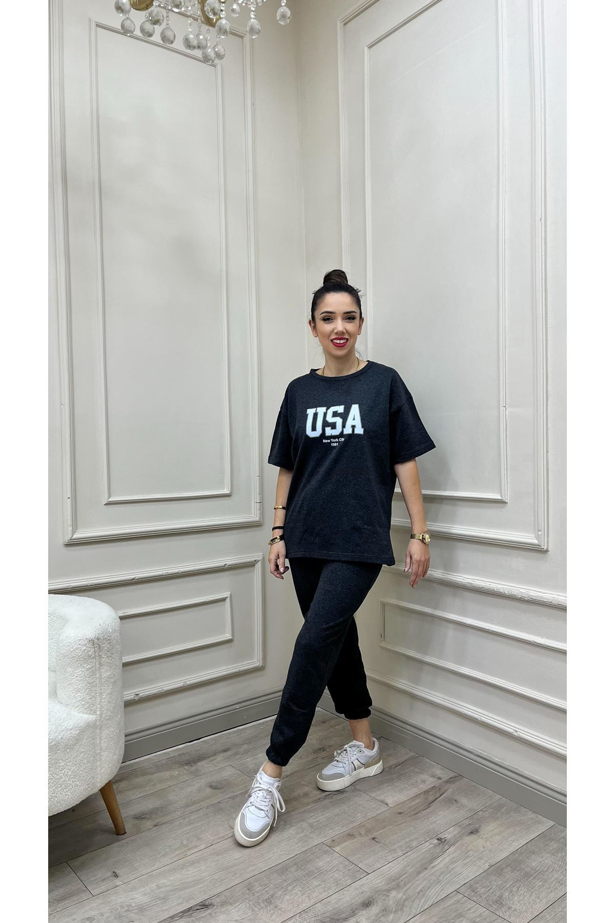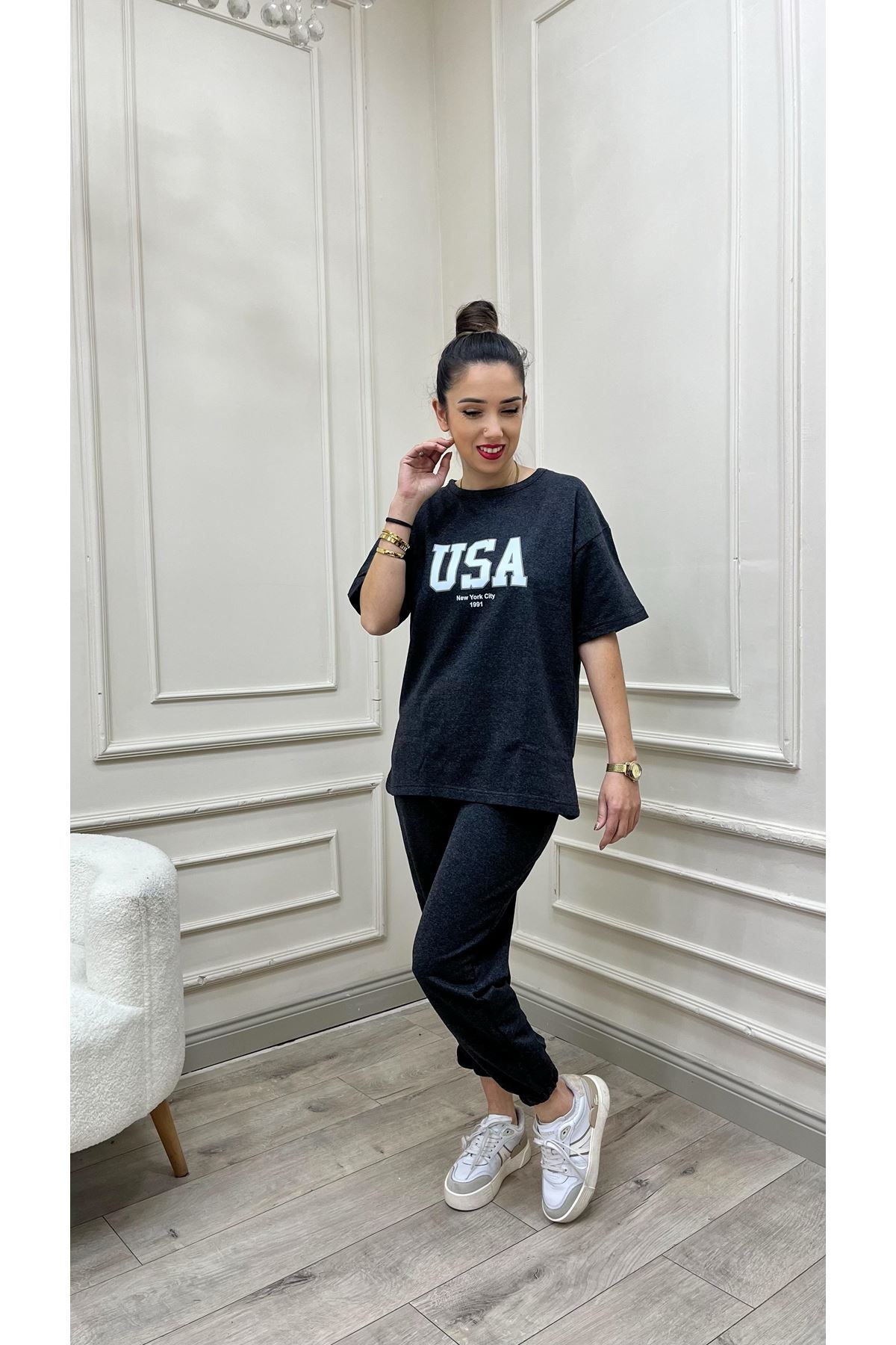 - Rahat kesimi ile günlük kullanım için ideal, oversize bisiklet yaka tasarım.; - Yüksek bel paça detayı sayesinde konforlu bir oturuş sunar.; - Pamuk polyester karışımı kumaşı, nefes alabilirliği artırarak gün boyu rahatlık sağlar.; - Yan cepleri ile pratik kullanım imkanı sunar; küçük eşyalarınızı yanınızda taşımanız kolaylaşır.; - Baskılı deseniyle dikkat çekici bir görünüm kazandırırken, füme rengi her ortama uyum sağlar.; - 30 derecede makinede tersten yıkama ve ütüleme önerisiyle bakımı kolaydır.; - Unisex koleksiyona ait bu takım, hem kadınların hem de erkeklerin gardırobunda yerini almayı hak ediyor.; - İki parçadan oluşan set, kombin yapmayı basitleştirerek stil sahibi görünmenizi sağlar.; - Cool & comfort persona ile günlük aktivitelerinizde şıklığından ödün vermeyenler için mükemmel seçimdir.