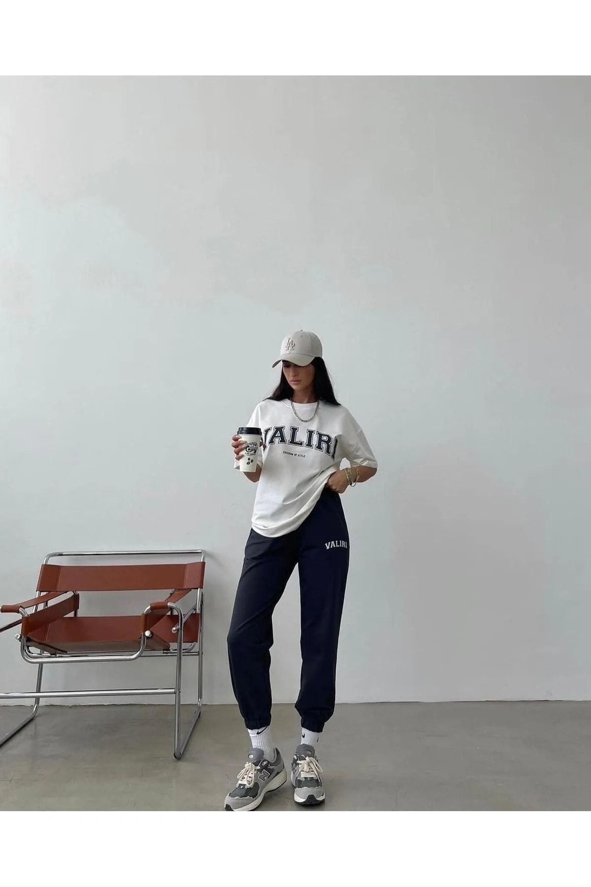 Valiri Beyaz T-shirt Siyah Eşofman Altı Jogger- Baskılı Alt Üst Eşofman Takım Oversize Bisiklet Yak