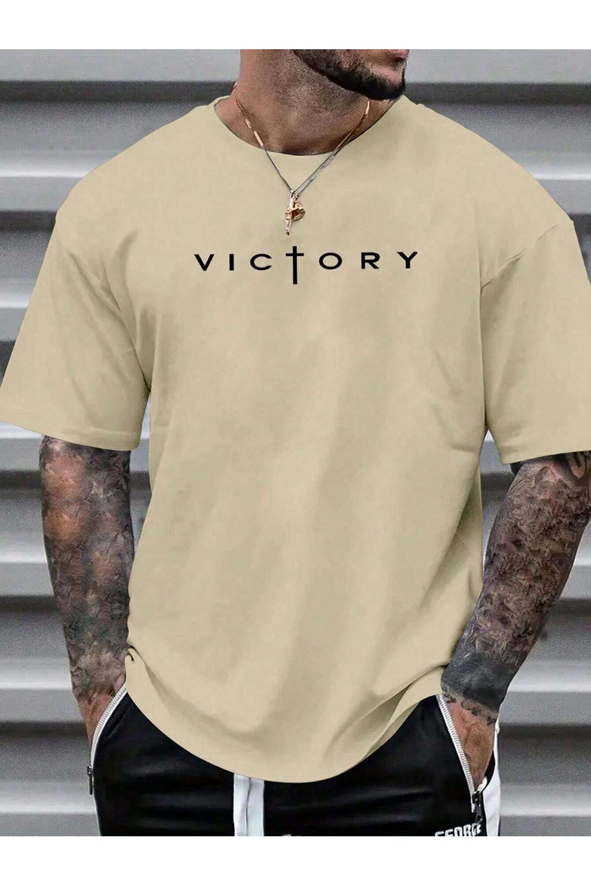 Victory Baskılı Süprem Bej T-Shirt - Oversize Bisiklet Yaka Tişört