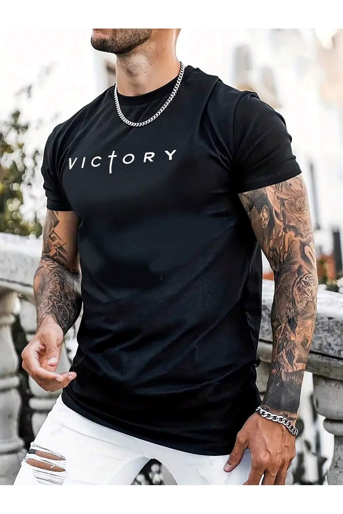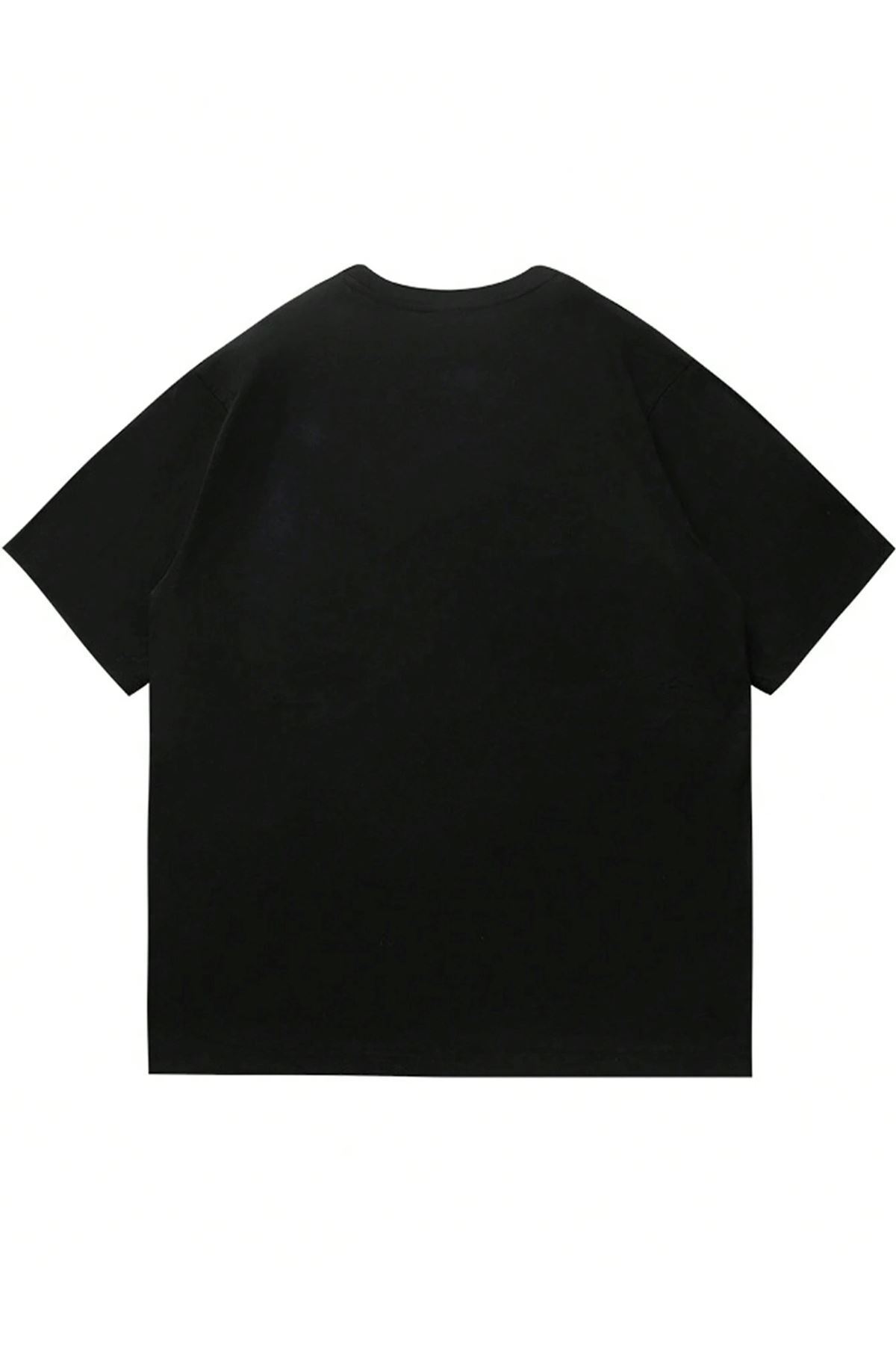 Victory Baskılı Süprem Siyah T-Shirt - Oversize Bisiklet Yaka Tişört
