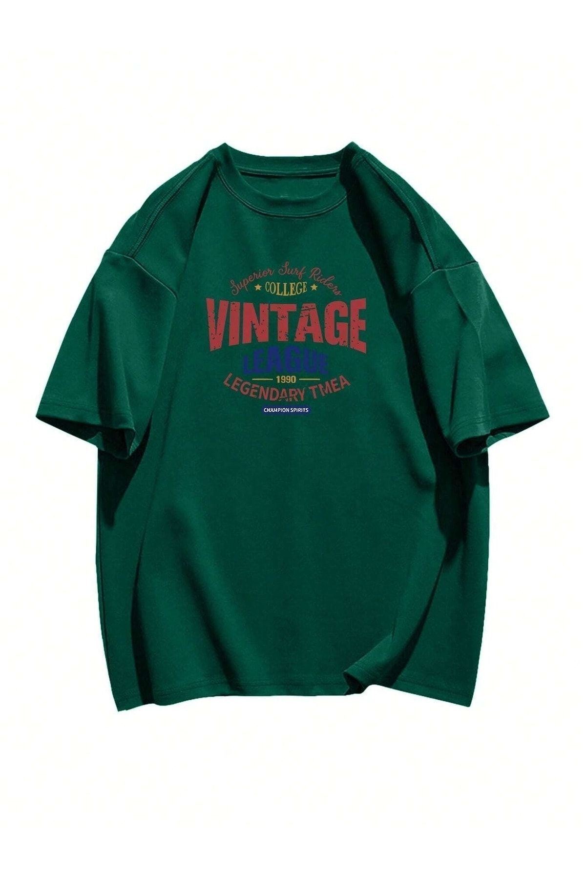 Vintage College T-Shirt - Yeşil Baskılı Oversize Bisiklet Yaka Kısa Kol