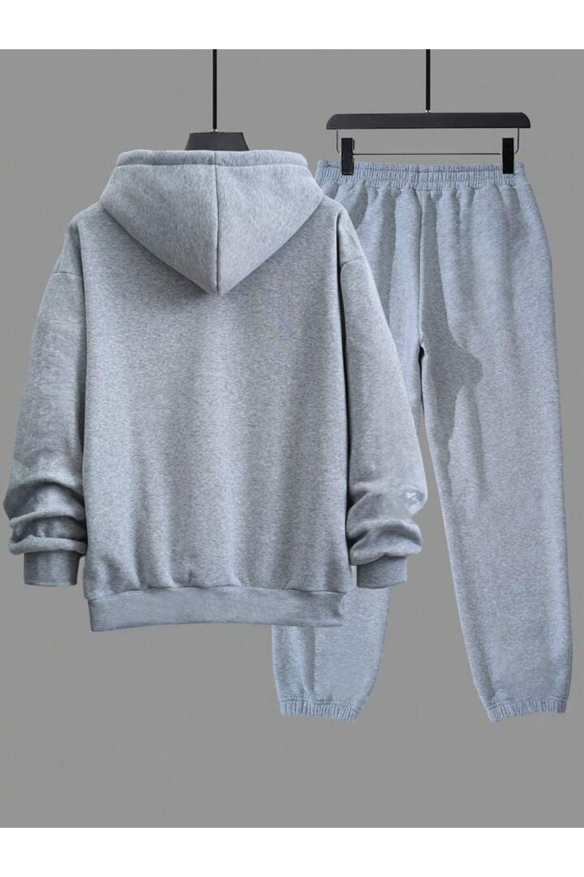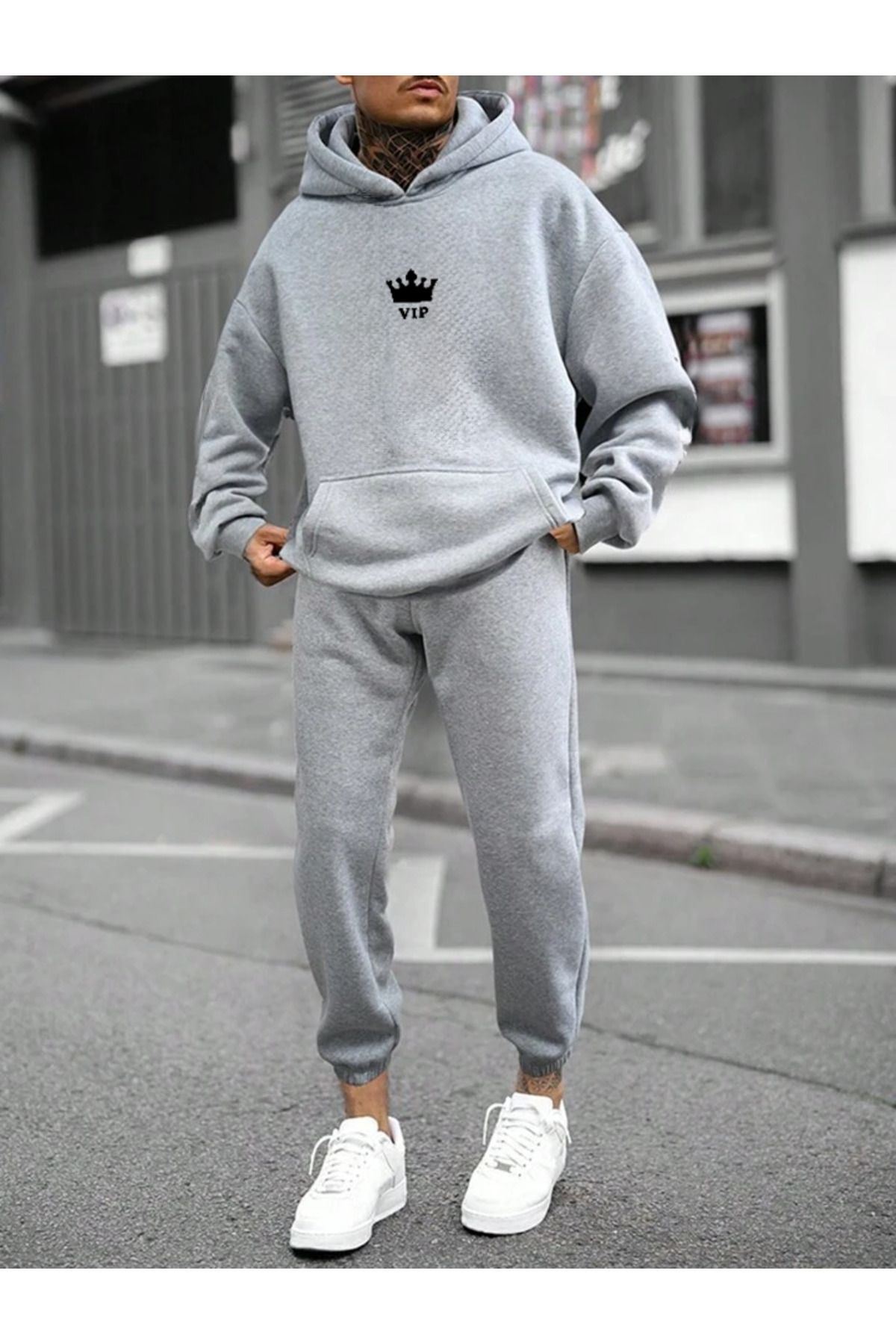 Vip Eşofman Takımı Sweatshirt Jogger - Gri Baskılı Oversize Şardonlu Kapüşonlu