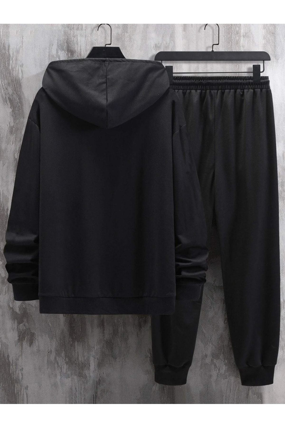 Vip Eşofman Takımı Sweatshirt Jogger - Siyah Baskılı Oversize Şardonlu Kapüşonlu