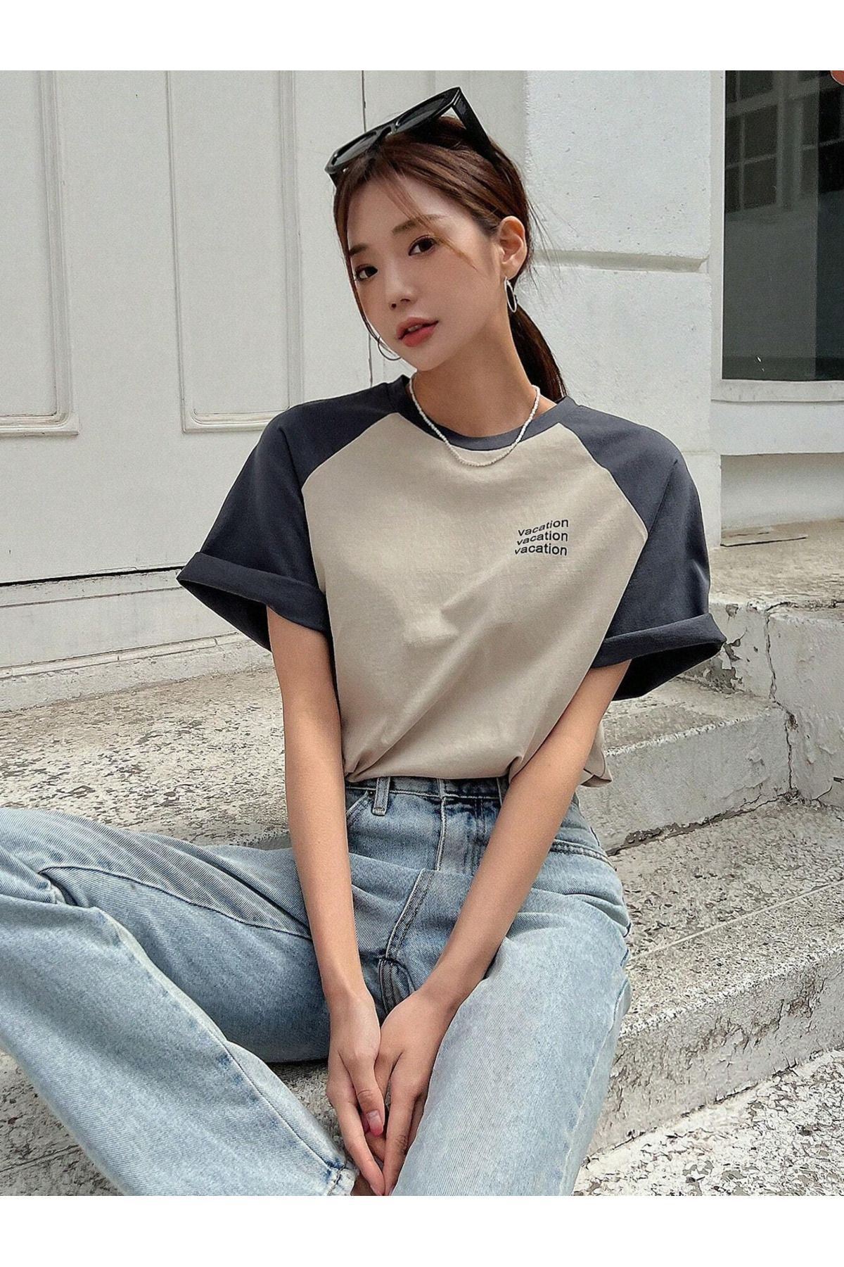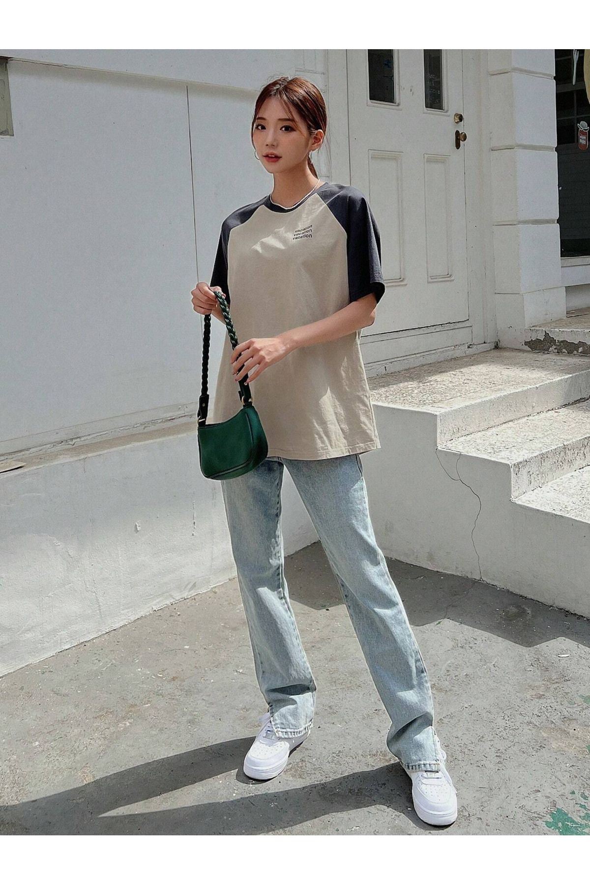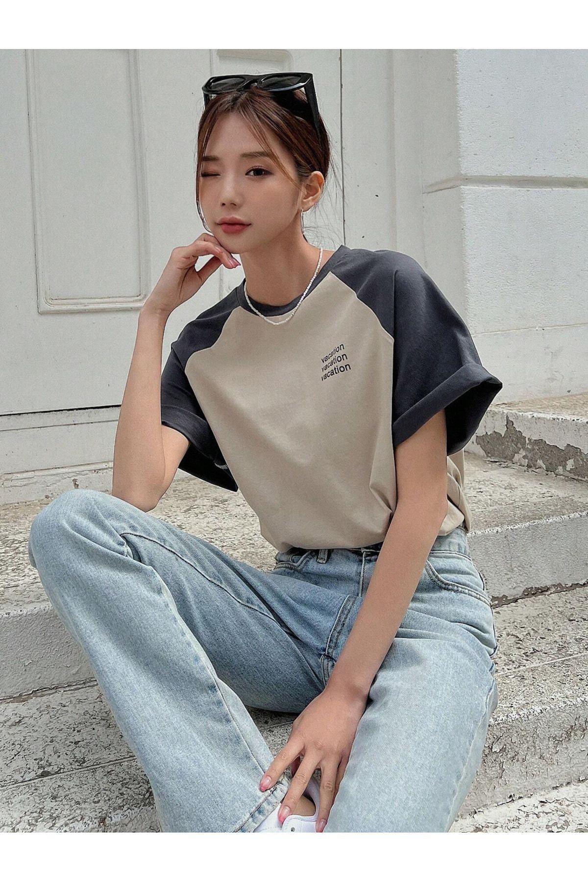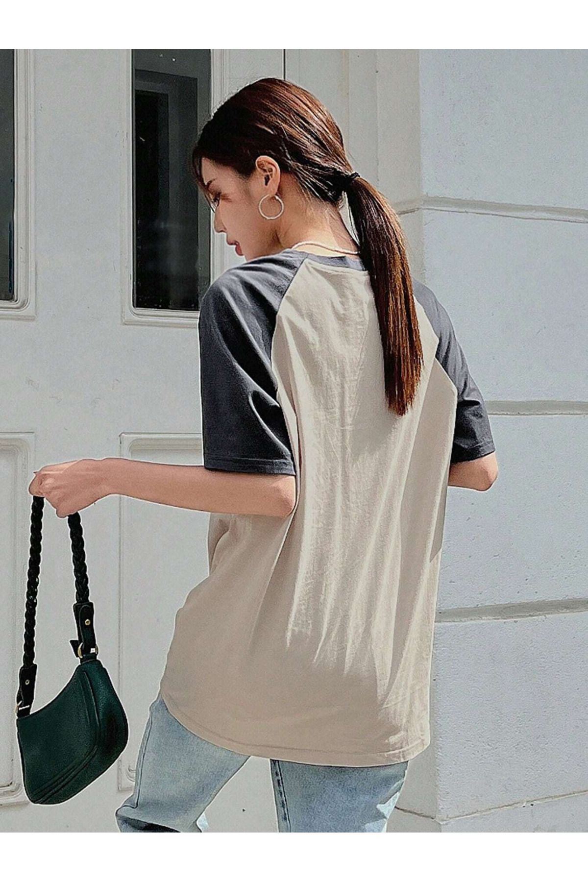 Vocation Parçalı Süprem T-Shirt - Bej Füme Baskılı Oversize Bisiklet Yaka Kısa Kol Tişört