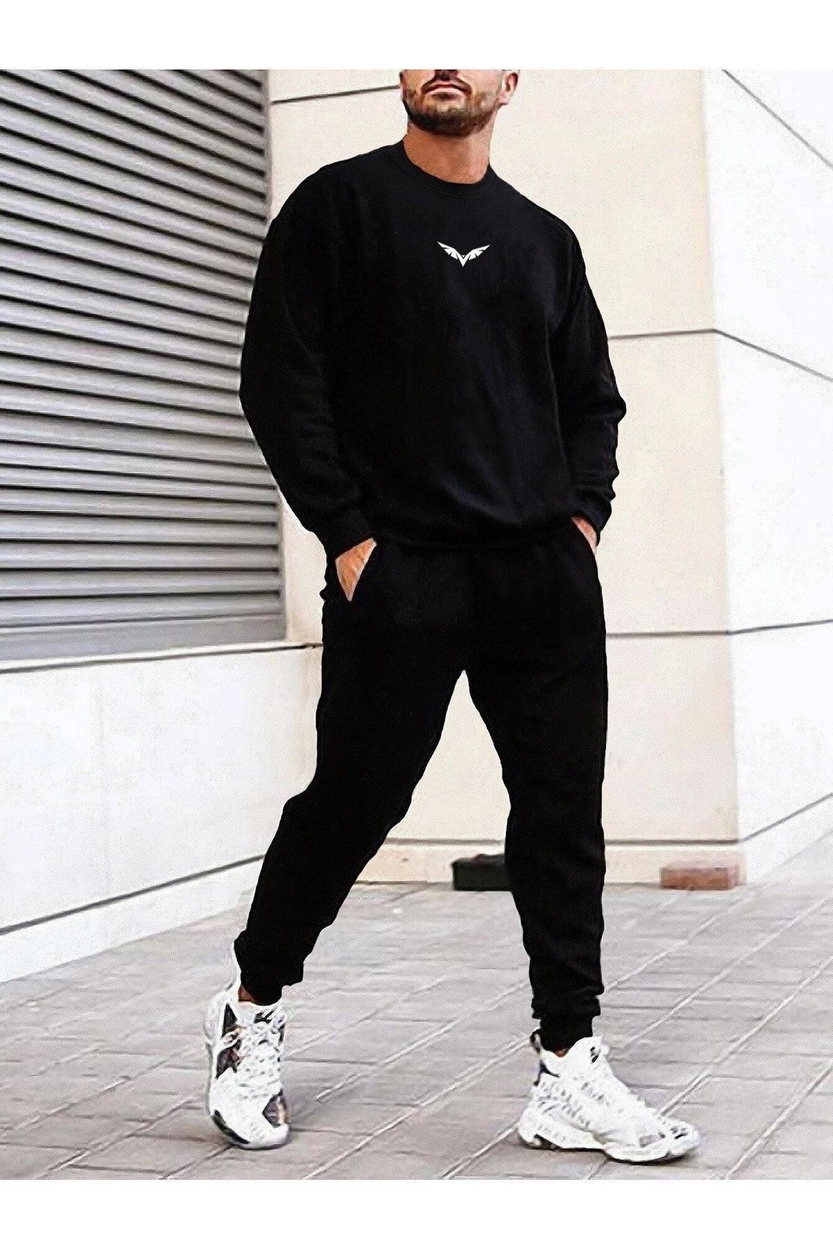 Wings Eşofman Takımı Sweatshirt Jogger - Siyah Baskılı Oversize Şardonlu Bisiklet Yaka