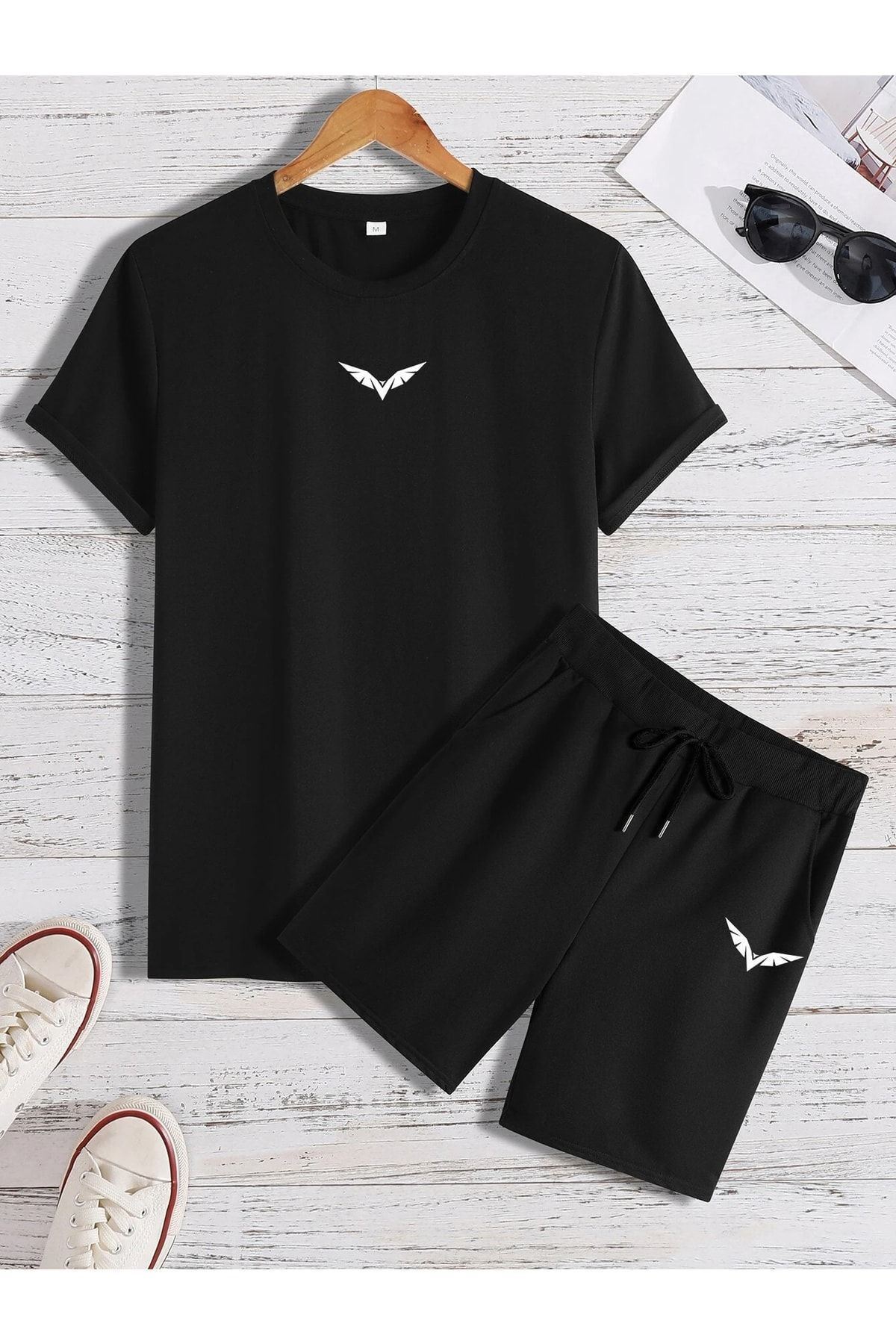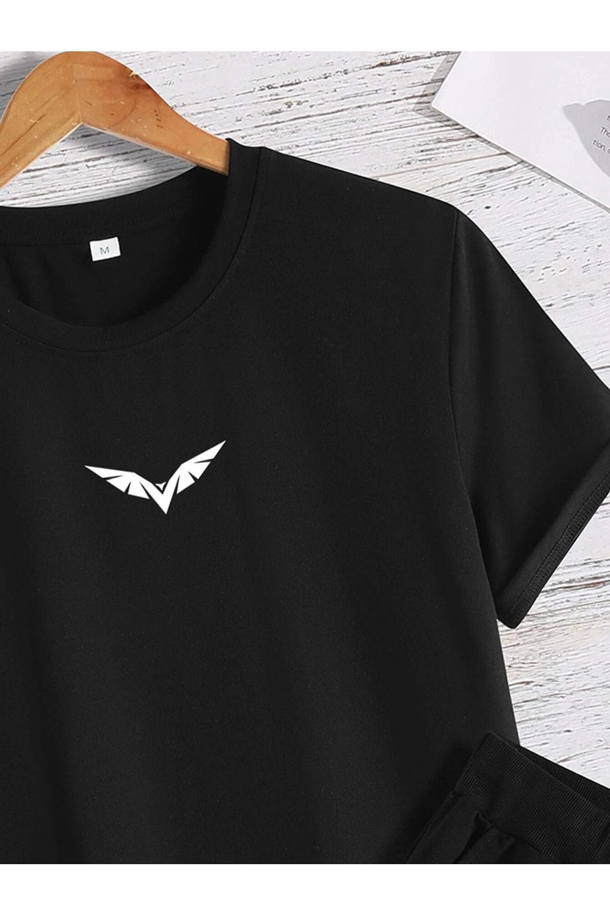 Wings T-shirt Şort - Siyah Alt Üst Kombin Şort Tişört Takım Baskılı Oversize Bisiklet Yaka