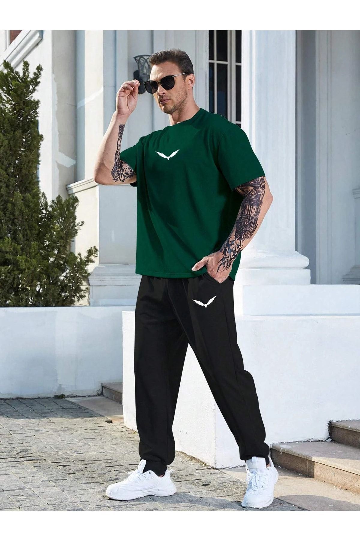 Wings Yeşil T-shirt Siyah Eşofman Altı Jogger- Baskılı Alt Üst Eşofman Takım Oversize Bisiklet Yaka