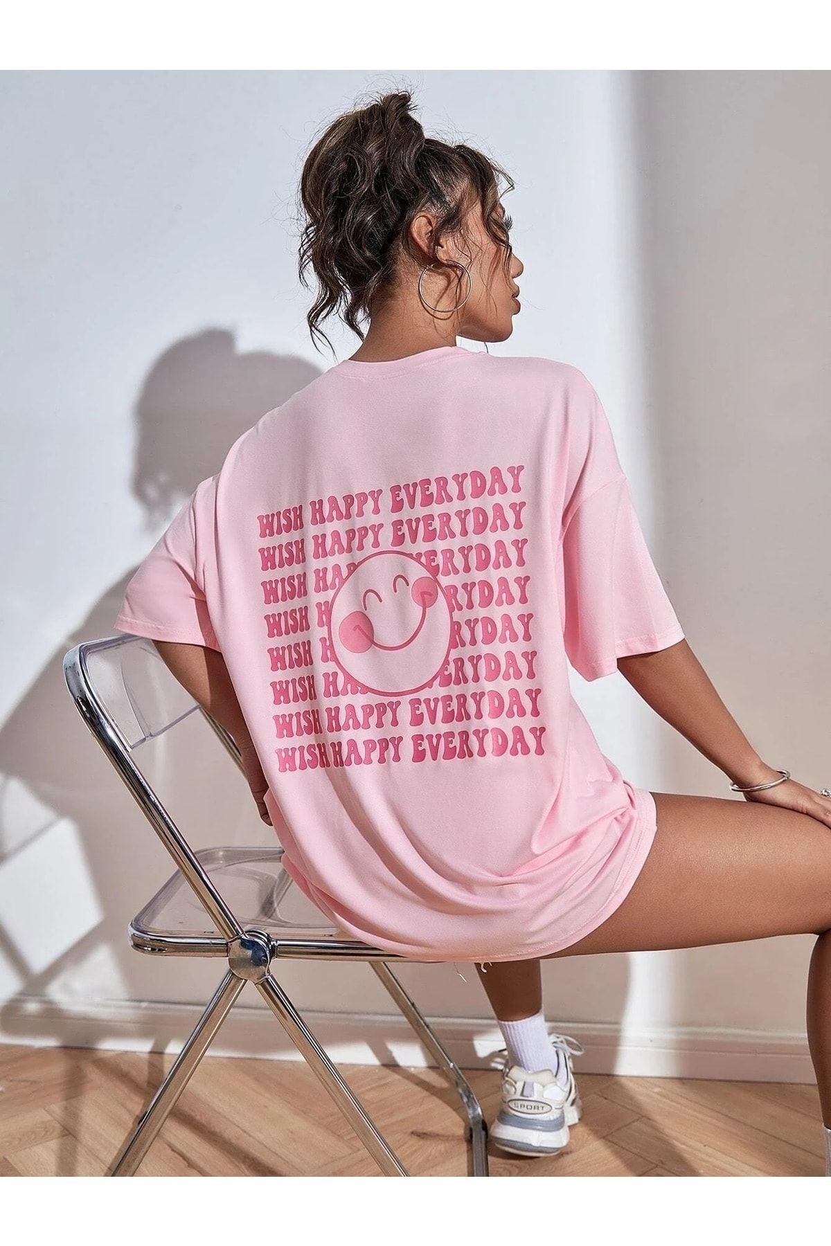 Wish Happy Süprem T-Shirt - Pembe Baskılı Oversize Bisiklet Yaka Kısa Kol Tişört