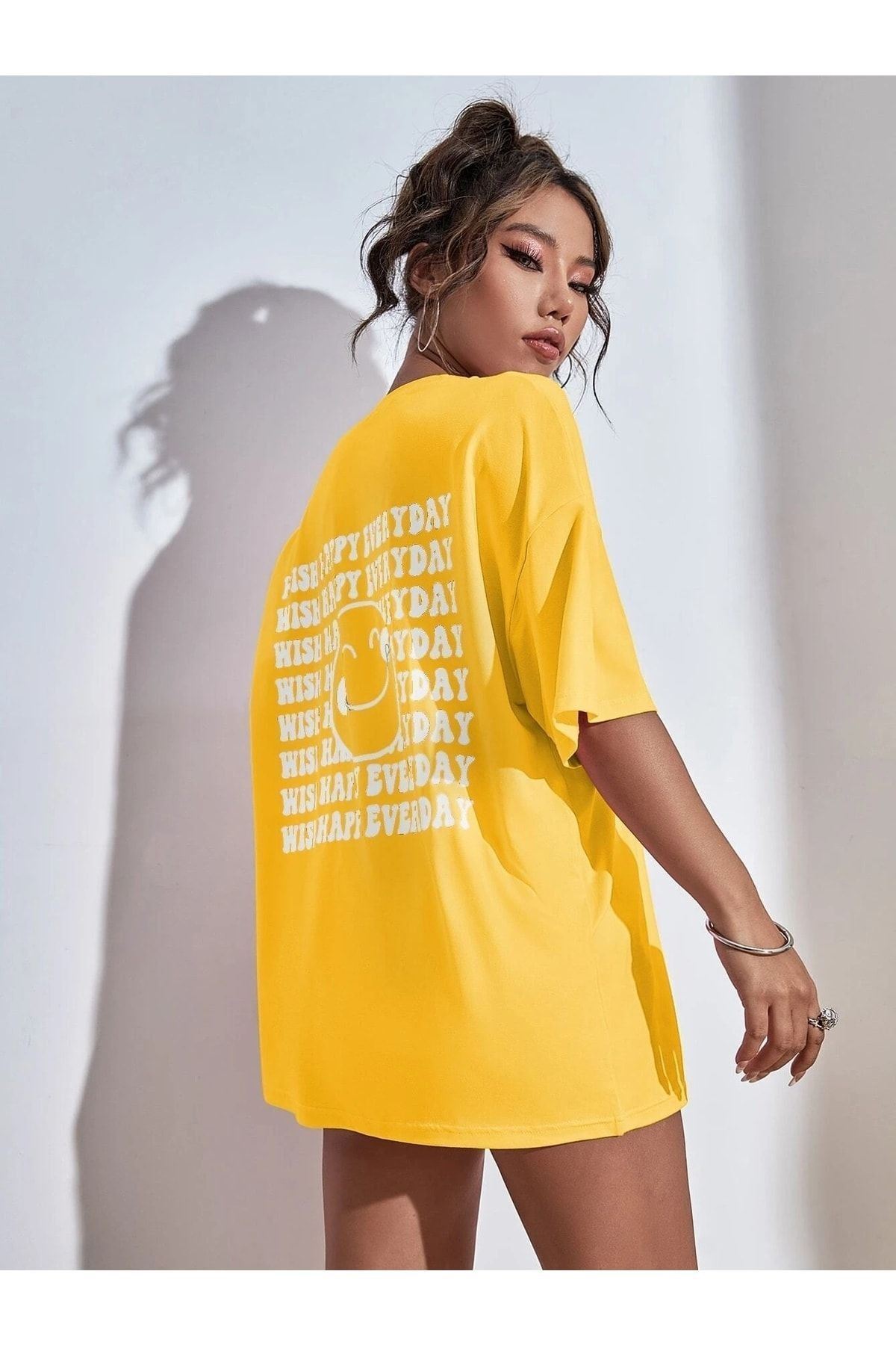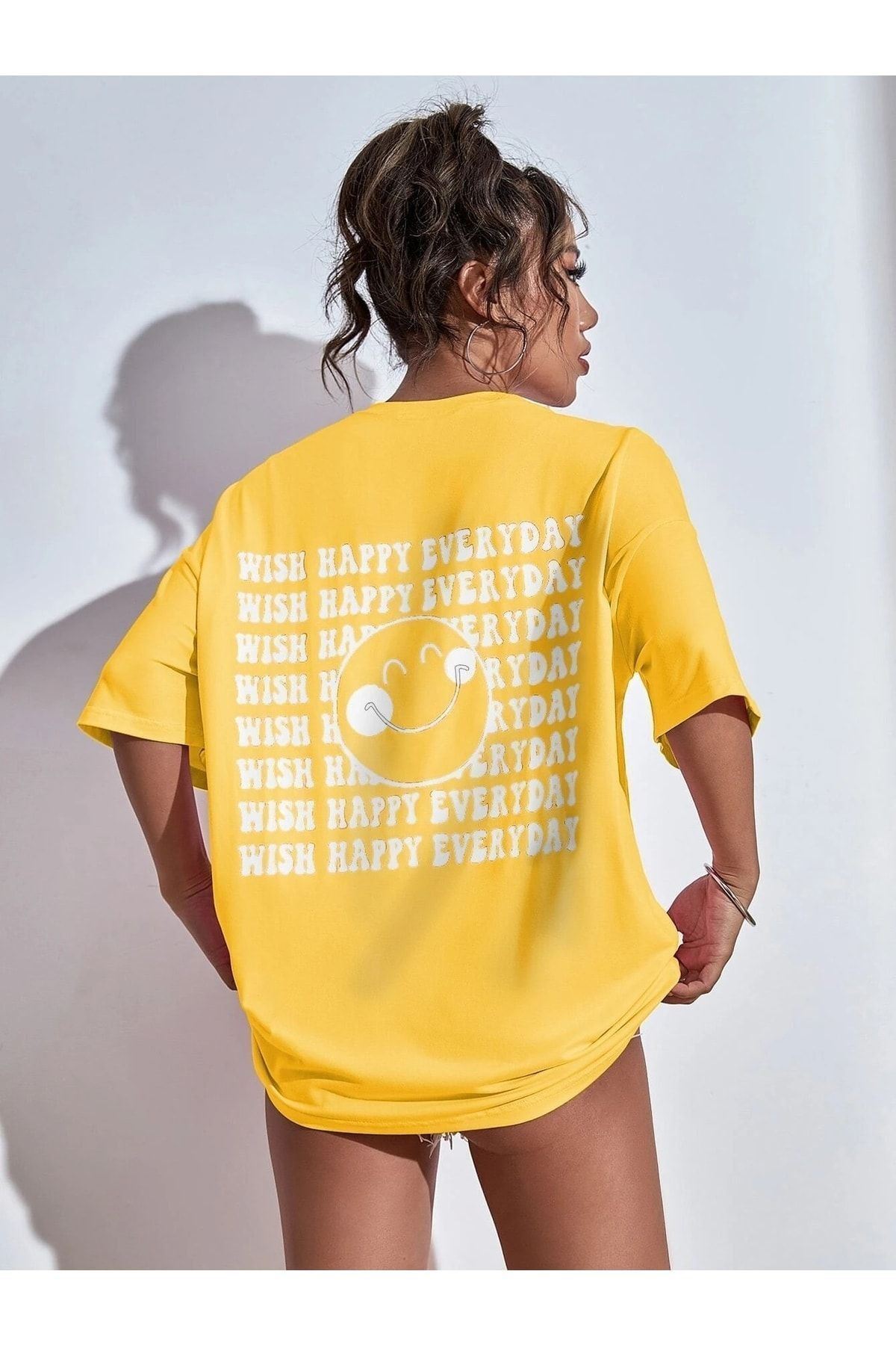 Wish Happy Süprem T-Shirt - Sarı Baskılı Oversize Bisiklet Yaka Kısa Kol Tişört